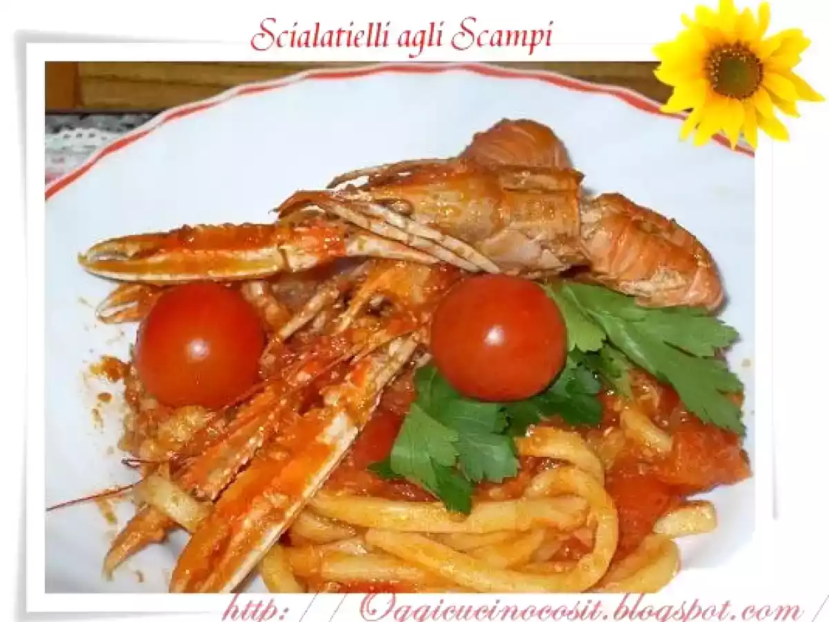 Scialatielli agli scampi Portata principalefacile35 min Invia questa ricetta ad un amico Stampa la ricetta Contatta l'autore della Ricetta Pubblica la foto di questa ricetta Ingredienti 4 Scampi 800 g. 1 filetto di cernia privato di tutte le spine Pomodorini ciliegia, o Pachino 2 spicchi d'aglio Brandy Prezzemolo sale-pepe Riduzione di brodo di pesce. Pecorino grattugiato Per gli SCIALATIELLI: 250 Farina 250g. Semola 3 uova 125 g. latte (aggiungere a occhio per la giusta consistenza) basilico tritato Parmigiano grattugiato (oppure grana) sale-pepe Noce moscata ( un pizzico)