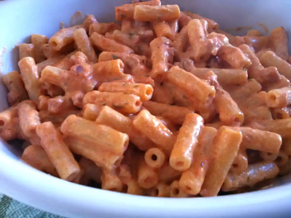 - Aggiungete la pancetta e mescolare, poi l'origano e mescolare, poi la panna e infine il sugo e il parmigiano.