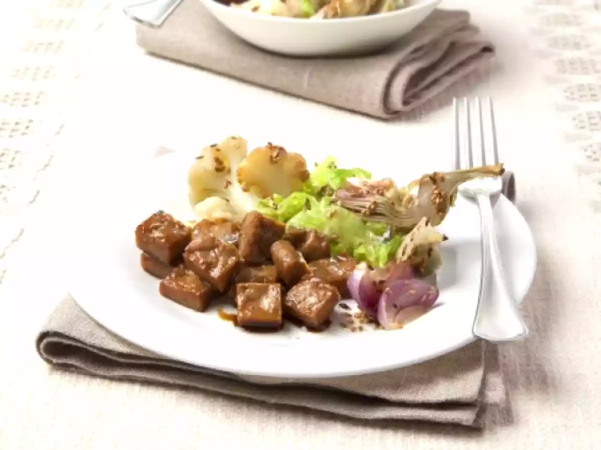 - Tagliate a dadi il seitan e rosolate nell'olio rimasto con l'aglio sbucciato intero. Bagnate con la salsa di soia e cuocete finché si assorbe e incomincia a caramellare. Servite con le verdure