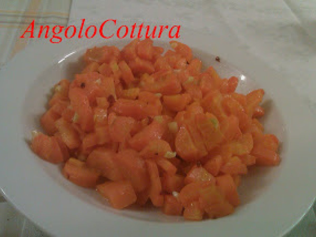Semplice contorno:carote all'insalata Portata principalefacile35 min122 Kcal Invia questa ricetta ad un amico Stampa la ricetta Contatta l'autore della Ricetta Pubblica la foto di questa ricetta Ingredienti 3 350 g carote 1 spicchio d'aglio peperoncino olio d'oliva aceto di vino bianco sale e pepe q.b Costo stimato: 1.38Euros€ (0.46€/Porzioni)