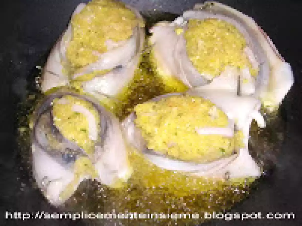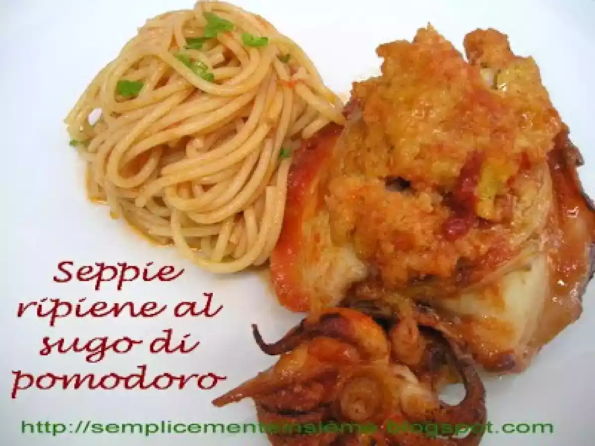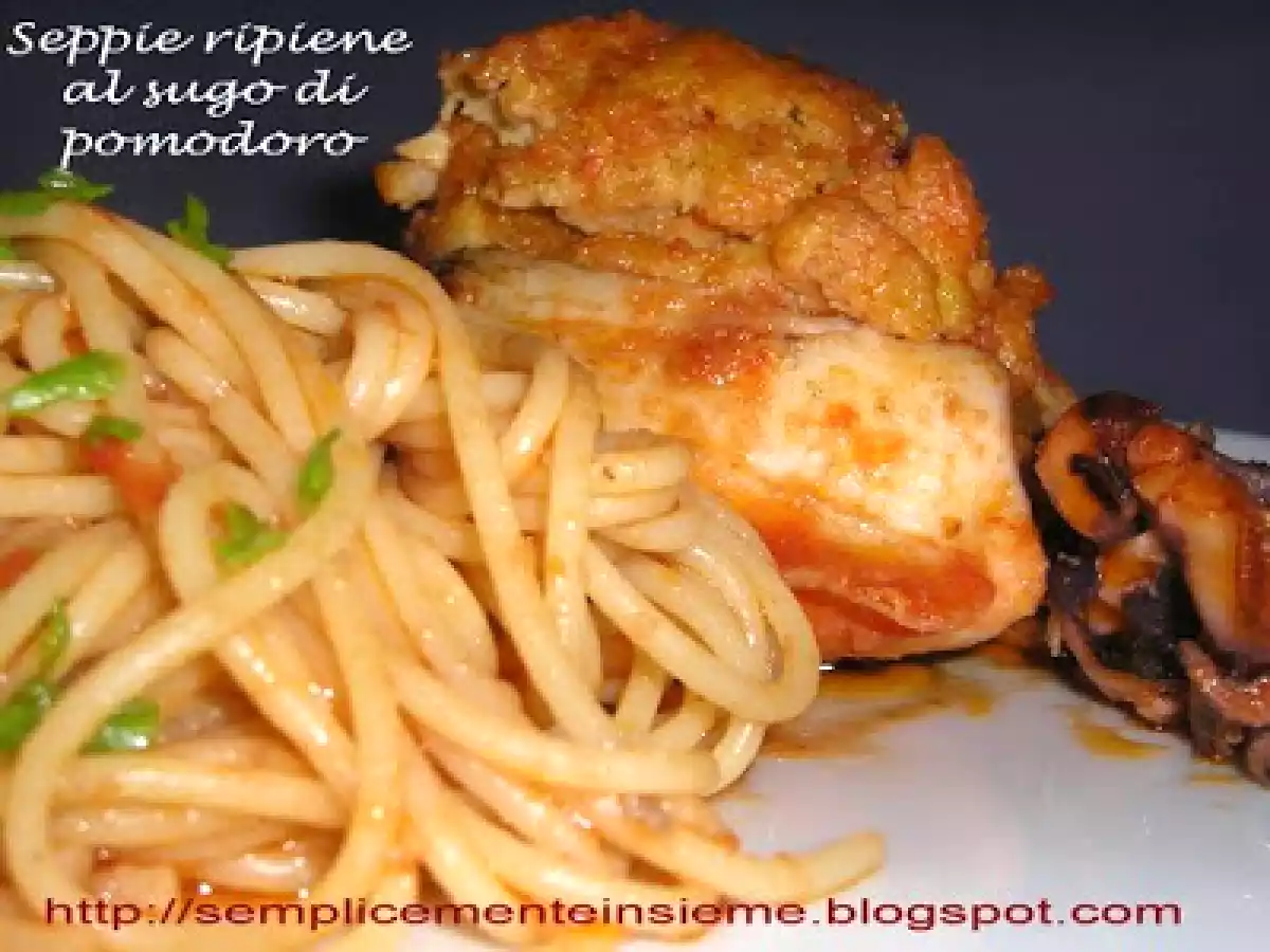 Seppie ripiene al sugo di pomodoro PrecedenteProssimo Portata principalefacile45 min Invia questa ricetta ad un amico Stampa la ricetta Contatta l'autore della Ricetta Pubblica la foto di questa ricetta Ingredienti 4 4 seppie medie e fresche mollica di pane fresca formaggio grattugiato,meglio se pecorino romano aglio tritato finemente sale e pepe q.b. olio extravergine di oliva 3-4 uova