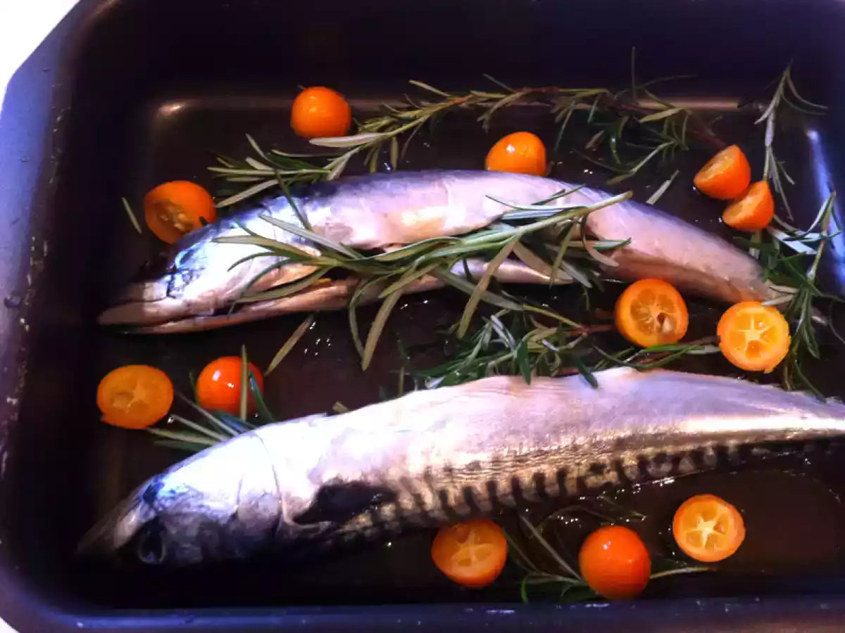Sgombro al forno con mandarini cinesi e passito Portata principalemedia38 min Invia questa ricetta ad un amico Stampa la ricetta Contatta l'autore della Ricetta Pubblica la foto di questa ricetta Ingredienti 2 2 sgombri 2 rametti di rosmarino 2 spicchi d’aglio 10 mandarini cinesi Mezzo bicchiere di passito 1 cucchiaio d’olio extravergine di oliva Sale all’arancia e curry