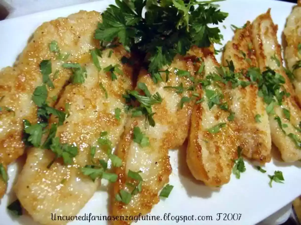 Sogliole al vino bianco Portata principalefacile25 min329 Kcal Invia questa ricetta ad un amico Stampa la ricetta Contatta l'autore della Ricetta Pubblica la foto di questa ricetta Ingredienti 4 8 filetti di sogliola freschi farina di riso olio d'oliva e burro 1 bicchiere di vino bianco prezzemolo tritato sale e pepe