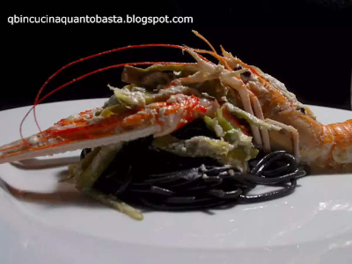 Spaghetti al nero di seppia con ricotta, scampi e carciofi