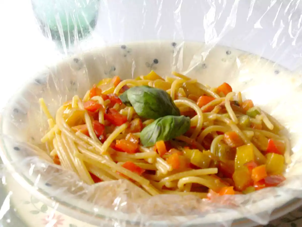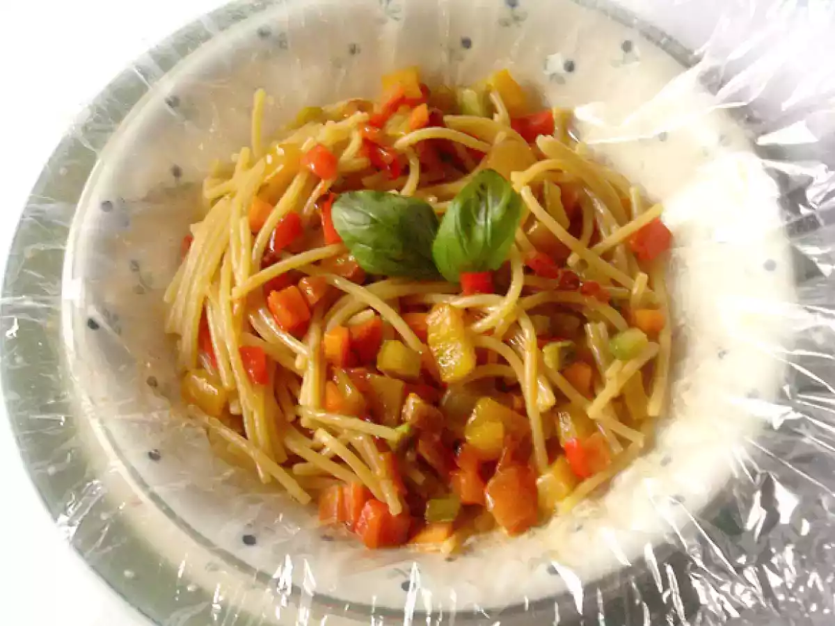 Spaghetti alla chitarra al profumo dell'orto in carta fata PrecedenteProssimo Portata principalefacile35 min514 Kcal Invia questa ricetta ad un amico Stampa la ricetta Contatta l'autore della Ricetta Pubblica la foto di questa ricetta Ingredienti 4 400 g di spaghetti alla chitarra 200 g di besciamella 1 zucchina 1 carota 1 peperone rosso e uno giallo 1 scalogno 2 pomodori Coriandolo in grani Olio extra vergine di oliva Sale Parmigiano Basilico per la decorazione