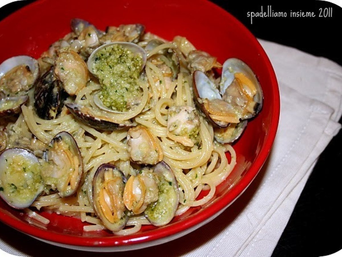 Spaghetti alle vongole con pesto di mandorle PrecedenteProssimo Portata principalemedia35 min654 Kcal Invia questa ricetta ad un amico Stampa la ricetta Contatta l'autore della Ricetta Pubblica la foto di questa ricetta Ingredienti 2 160gr di spaghetti 1 kg di vongole due manciate di mandorle sgusciate un mazzo di basilico e un pò di prezzemolo olio extra vergine uno spicchio d'aglio