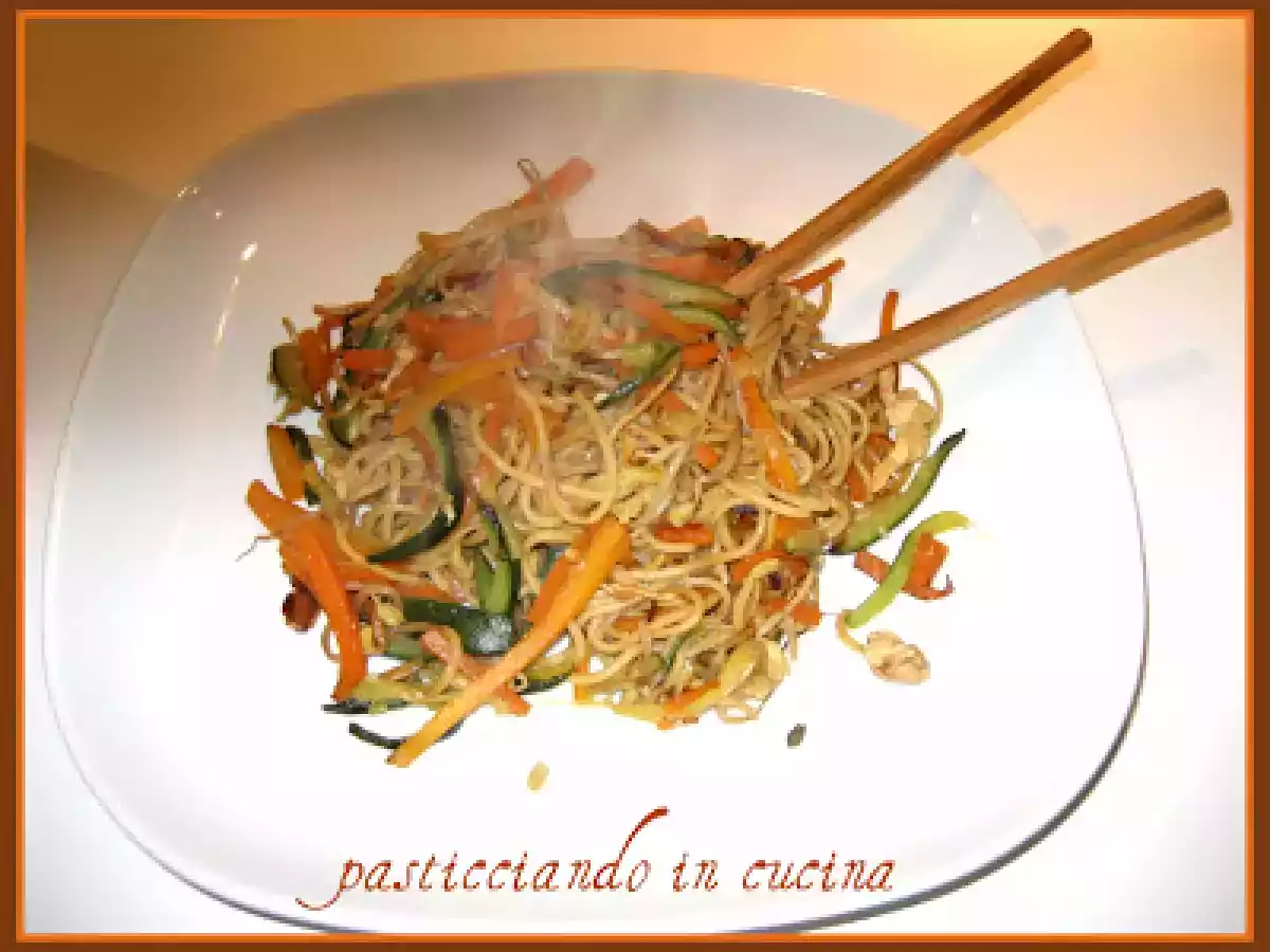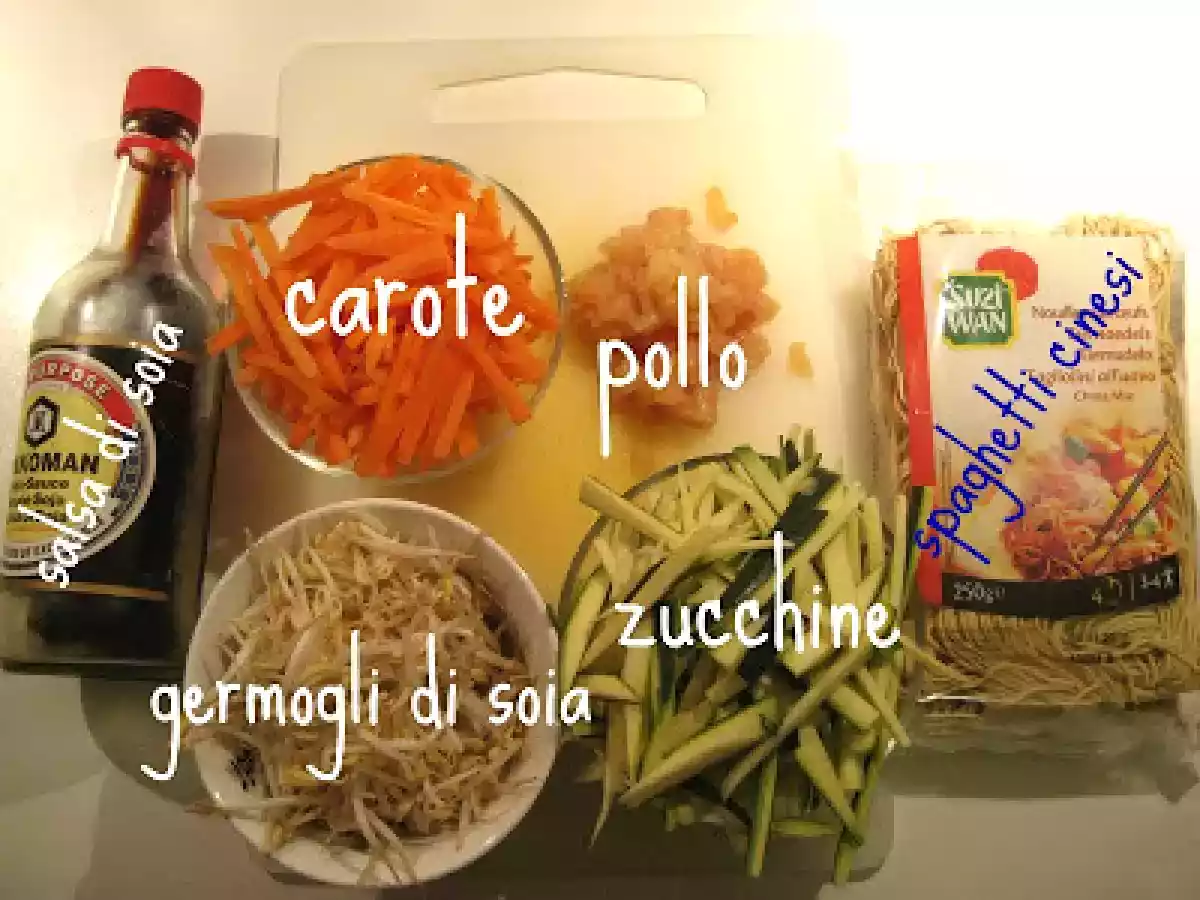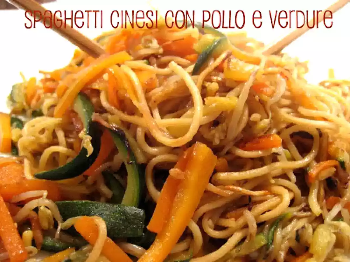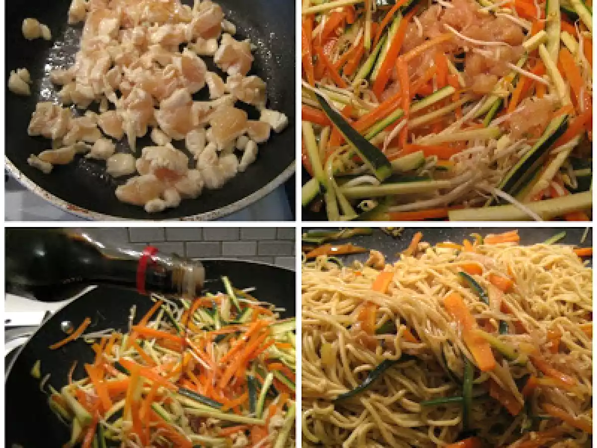 Spaghetti cinesi con pollo e verdure PrecedenteProssimo Portata principalefacile50 min322 Kcal Invia questa ricetta ad un amico Stampa la ricetta Contatta l'autore della Ricetta Pubblica la foto di questa ricetta Dalla sfoglia di verdure croccanti ben fornito. Ingredienti 4 250 g di spaghetti cinesi 2 carote 2 zucchine 1 petto di pollo 100 g di germogli di soia salsa di soia qb olio d'oliva extravergine qb Costo stimato: 4.02Euros€ (1€/Porzioni)