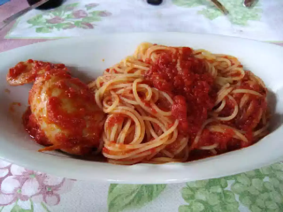 Spaghetti con calamari ripieni. PrecedenteProssimo Portata principalefacile35 min521 Kcal Invia questa ricetta ad un amico Stampa la ricetta Contatta l'autore della Ricetta Pubblica la foto di questa ricetta Ingredienti 2 per il sugo: salsa di pomodoro olio extravergine di oliva cipolla sale e peperoncino per i calamari: calamari freschi peperoncino piccante sale olio extravergine di oliva vino bianco per la farcia: mollica di pane formaggio grattugiato provola grattugiata prezzemolo tritato Costo stimato: 2.82Euros€ (1.41€/Porzioni)