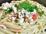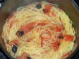 Spaghetti con filetti di merluzzo PrecedenteProssimo Portata principalemedia25 min Invia questa ricetta ad un amico Stampa la ricetta Contatta l'autore della Ricetta Pubblica la foto di questa ricetta Ingredienti 3 200 gr di spaghetti 50 gr di olio extra vergine di oliva 1 spicchio d'aglio grattugiato prezzemolo tritato mezzo cucchiaio di concentrato di pomodoro 8 pomodorini tagliati a pezzettini 300 gr di filetti di merluzzo qualche cappero sale q.b. mezzo bicchiere di acqua
