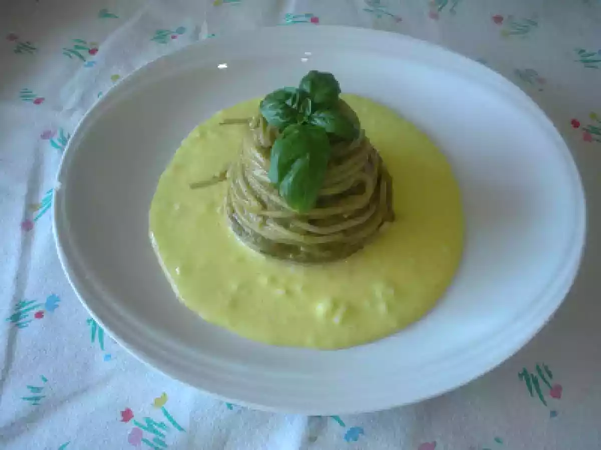Spaghetti con vellutata di avocado su crema di vaniglia