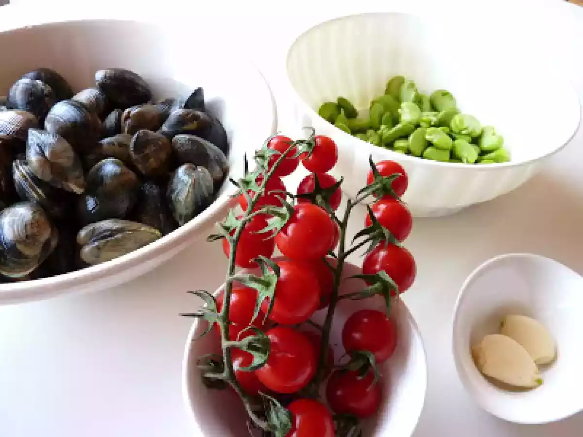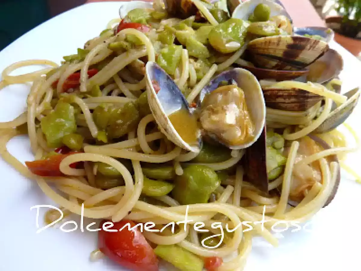 Spaghetti con vongole e fave PrecedenteProssimo Portata principalefacile22 min Invia questa ricetta ad un amico Stampa la ricetta Contatta l'autore della Ricetta Pubblica la foto di questa ricetta Ingredienti 2 500 g di spaghetti 1 kg di vongole veraci un pò di pomodorino 2 spicchi di aglio circa 100 g di fave sgusciate 1 bicchiere di vino bianco 1 ciuffetto di prezzemolo
