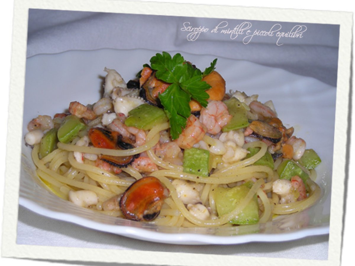 Spaghetti con zucchine, cozze, seppioline e gamberetti Portata principalefacile45 min Invia questa ricetta ad un amico Stampa la ricetta Contatta l'autore della Ricetta Pubblica la foto di questa ricetta Ingredienti 4 380 g di spaghetti 500 g di cozze fresche 200 g di gamberetti sgusciati 5 seppioline 4 zucchine romane piccole 2 spicchi di aglio un po'di vino bianco olio extra vergine di oliva sale pepe