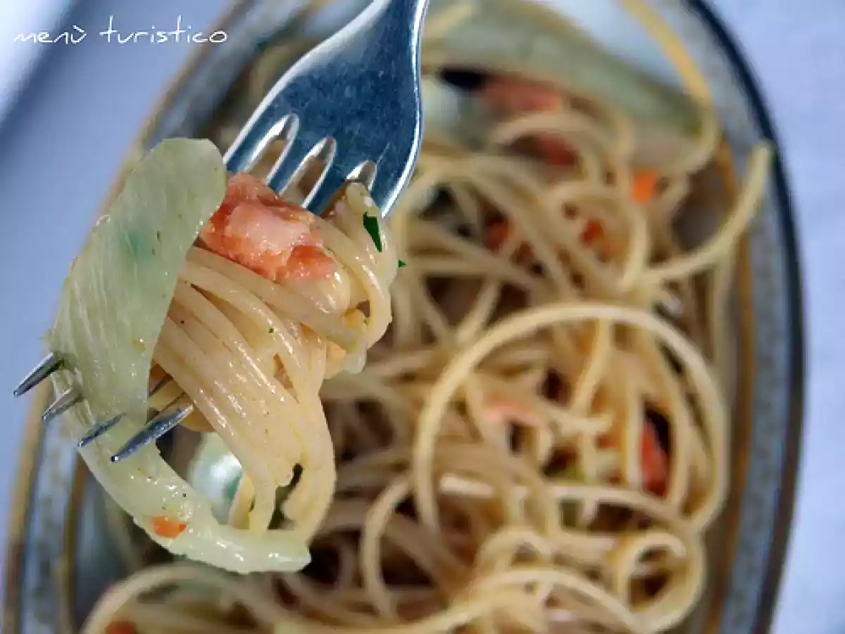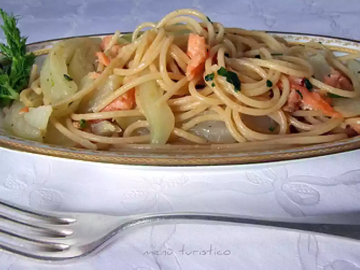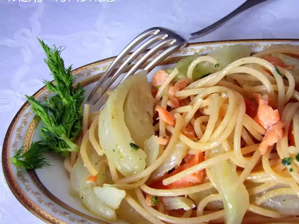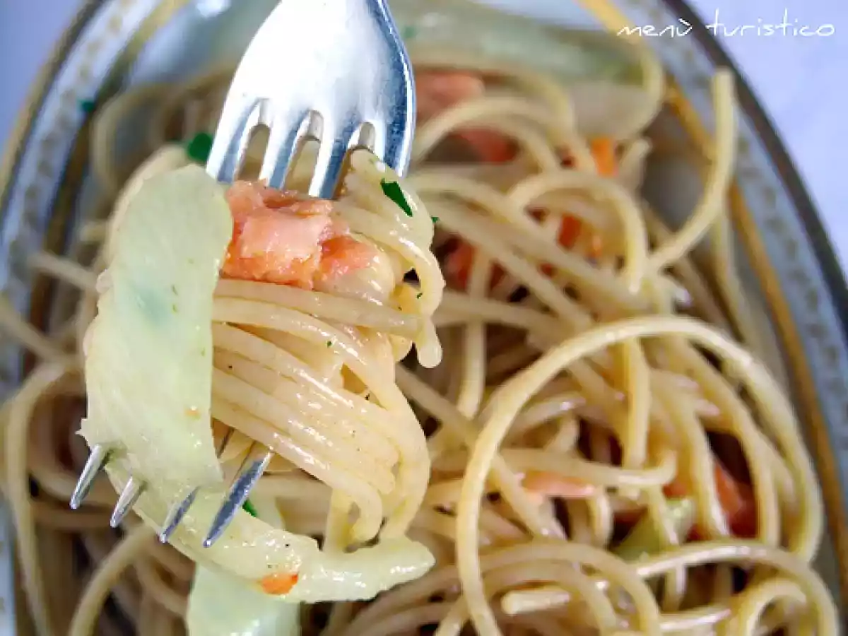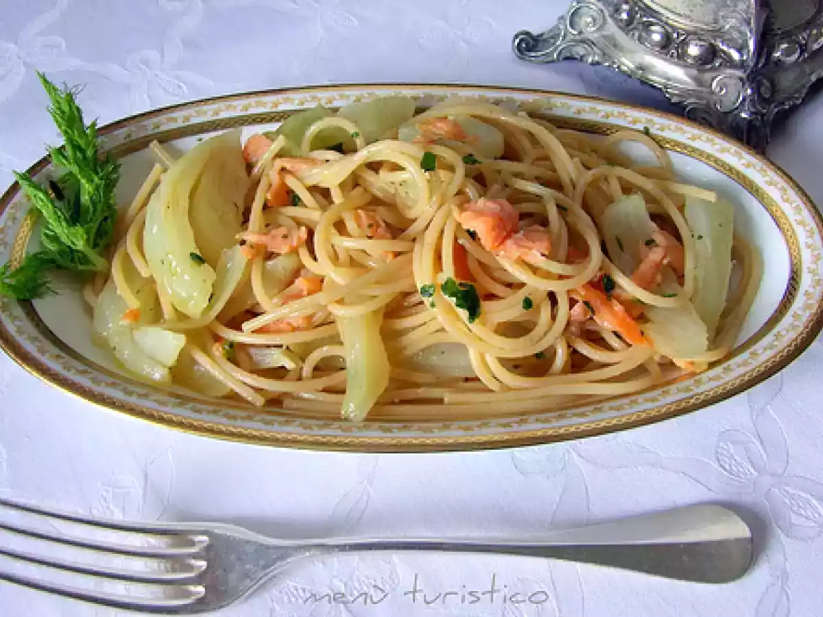 Spaghetti integrali con finocchi e salmone affumicato PrecedenteProssimo Portata principalefacile50 min585 Kcal Invia questa ricetta ad un amico Stampa la ricetta Contatta l'autore della Ricetta Pubblica la foto di questa ricetta Ingredienti 4 320 g di spaghetti integrali 1 finocchio 100 g di salmone affumicato 2 spicchi d'aglio 1 peperoncino 1 ciuffo di prezzemolo 8 cucchiai d'olio evo sale Costo stimato: 7.17Euros€ (1.79€/Porzioni)