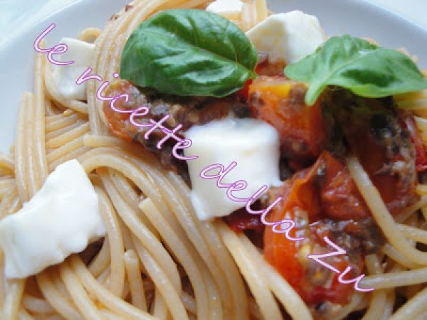 Spaghetti integrali con pomodori ciliegino, stracchino e crema di olive vota adesso Portata principalefacile37 min719 Kcal Invia questa ricetta ad un amico Stampa la ricetta Contatta l'autore della Ricetta Pubblica la foto di questa ricetta Ingredienti 2 200 g di spaghetti integrali 2 cucchiai di olive nere denocciolate 4 capperi 2 filetti di acciuga sott'olio 2 pomodori secchi sgocciolati dal loro olio 10 pomodori ciliegino 1 spicchio d'aglio olio 2 cucchiai di latte stracchino a piacere