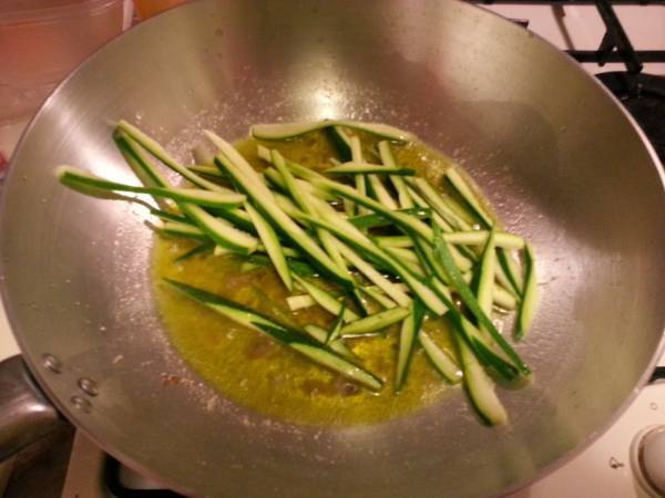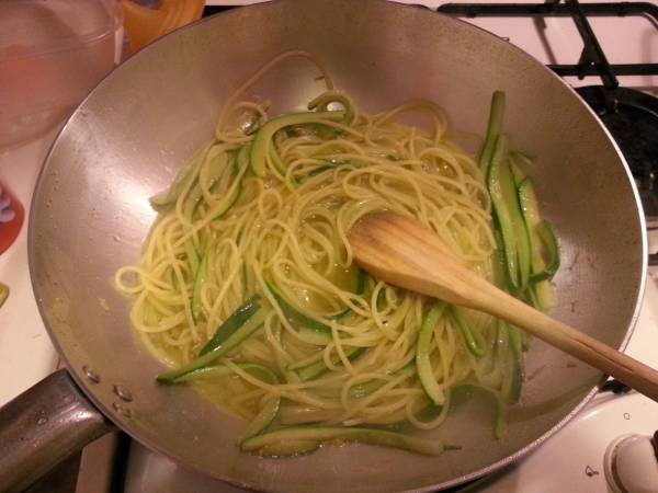 Dopo aver messo a bollire l'acqua per la pasta, potete iniziare a preparare il condimento. Fate soffriggere l'olio con l'aglio, quando quest'ultimo sarà dorato aggiungete un'alice ed un goccio d'acqua e fate cuocere fino a quando l'alice non si sarà sciolta. Tagliate le zucchine a listarelle abbastanza fini (mi raccomando solo la parte verde) e versatele nel sugo. Buttate la pasta, dopo tre minuti scolatela e terminatela di cuocere nella padella del condimento aggiungendo di tanto in tanto un po' d'acqua