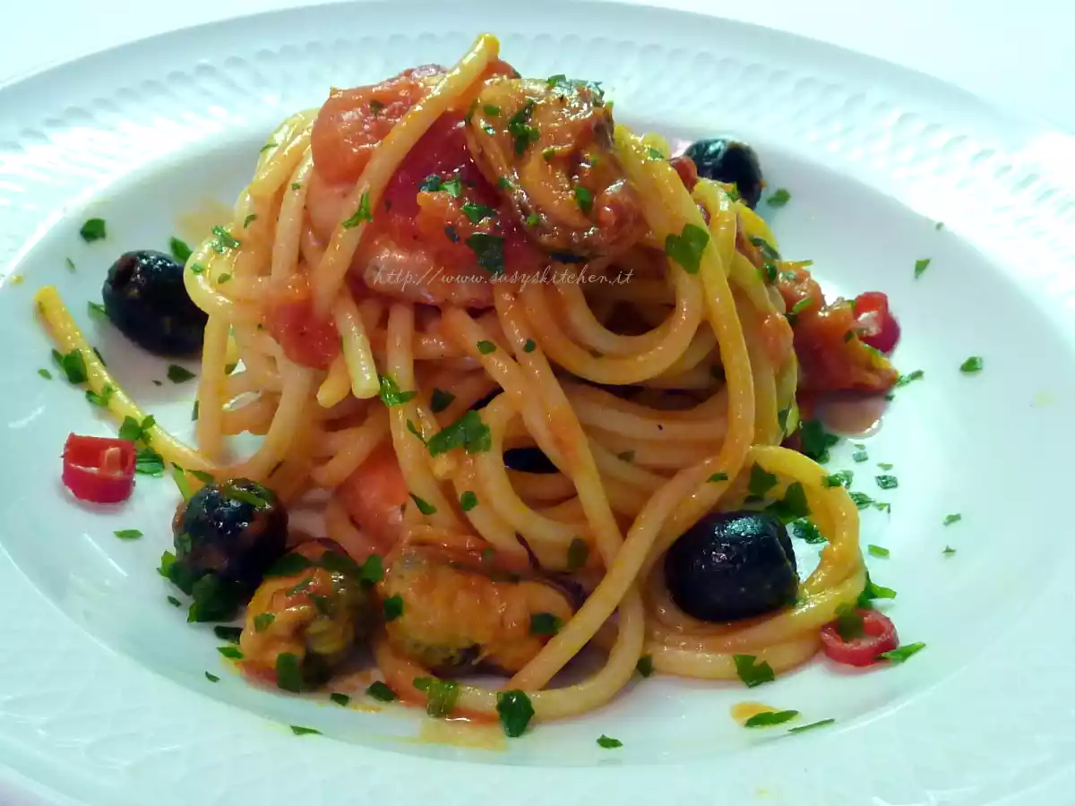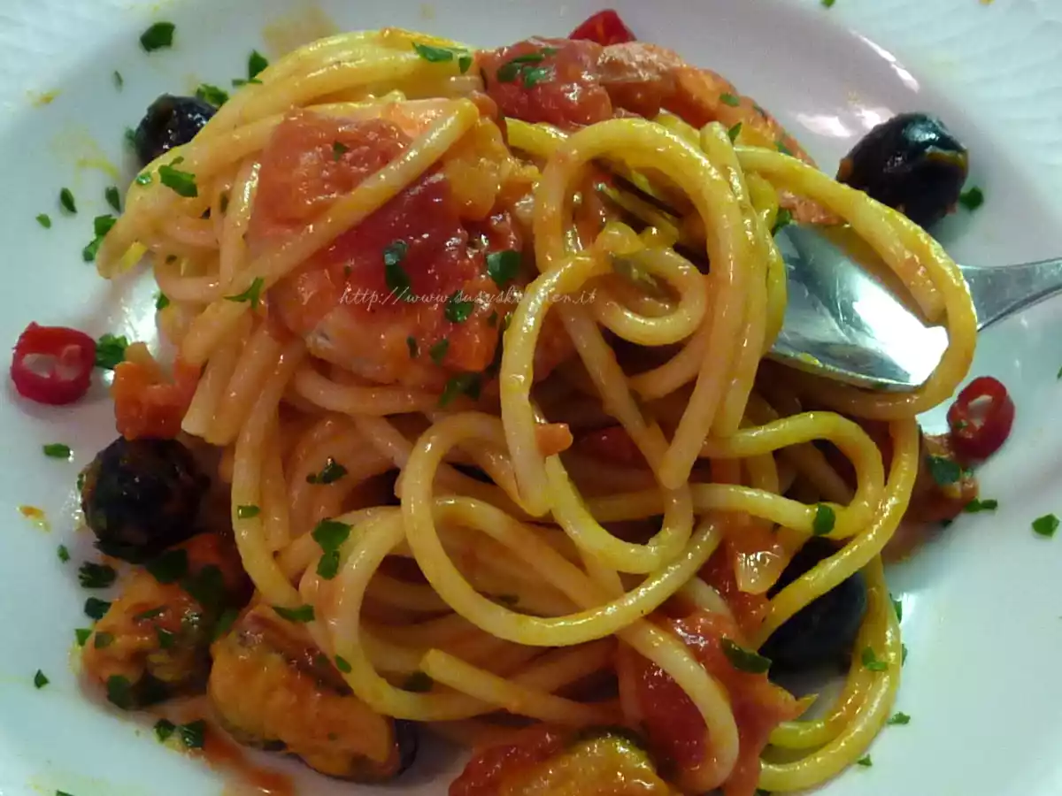 Spaghettoni speziati cozze e gamberi PrecedenteProssimo Portata principalemedia35 min Invia questa ricetta ad un amico Stampa la ricetta Contatta l'autore della Ricetta Pubblica la foto di questa ricetta Ingredienti 2 per 2 persone Ingredienti hg 2,40 di spaghettoni, trafilati a bronzo, o comunque belli ruvidi 200 gr di cozze surgelate (picard) 150 gr di code di gamberi surgelate 1 cipolla un barattolo di polpa di pomodoro paprika una spolverata curcuma una spolverata brandy per sfumare/ o vino bianco) 10 olive nere (non troppo amare) tabasco peperoncino fresco ( a piacere) sale q.b pepe q.b prezzemolo q.b olio e.v.o latte zucchero un pizzico