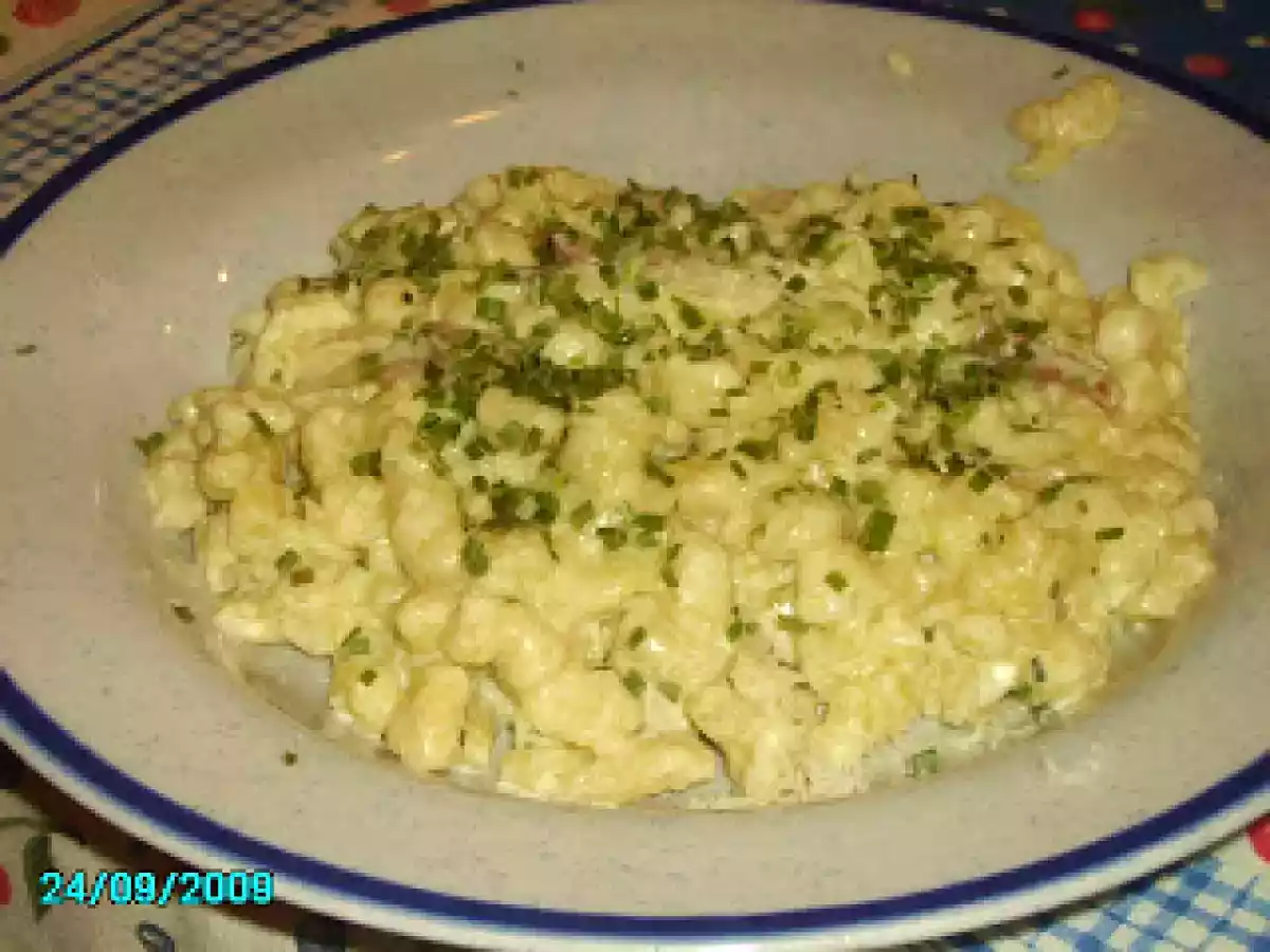Spatzle allo speck e panna Portata principalefacile40 min Invia questa ricetta ad un amico Stampa la ricetta Contatta l'autore della Ricetta Pubblica la foto di questa ricetta Ingredienti 4 Per l'impasto: 400 g farina 4 uova sale acqua 60 ml Per il condimento: olio panna da cucina 200 ml speck 2 fette erba cipollina 2 cucchiai