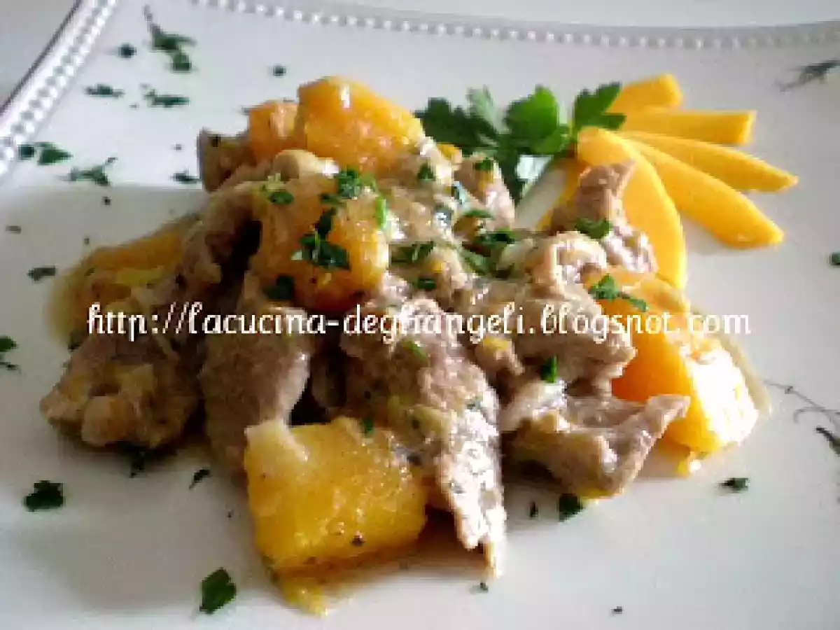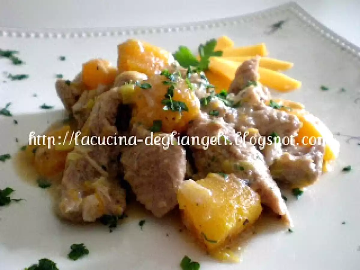 Spezzatino con zucca e porri al profumo di marsala vota adesso PrecedenteProssimo Portata principalefacile1 h 10 m Invia questa ricetta ad un amico Stampa la ricetta Contatta l'autore della Ricetta Pubblica la foto di questa ricetta Ingredienti 5 600 gr di spalla di maiale tagliata a bocconcini 1 porro di circa 200 gr 300 gr di zucca mantovana già pulita e tagliata a tocchetti 50 gr di marsala secco Maizena Q.b. per infarinare 200 gr di brodo fatto can il dado bimby 30 gr di olio extravergine di oliva 1 cucchiaino di maggiorana secca 1 spicchio d'aglio 1 ciuffetto di prezzemolo sale e pepe Q.b.