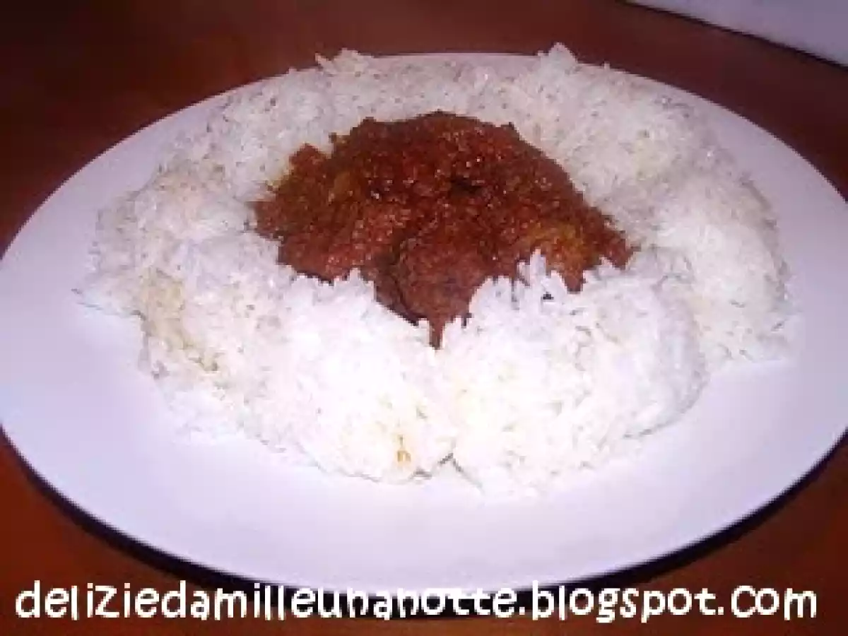 Spezzatino speziato e riso basmati Portata principalemedia1 h 20 m Invia questa ricetta ad un amico Stampa la ricetta Contatta l'autore della Ricetta Pubblica la foto di questa ricetta Ingredienti 4 Ingredienti per 4: 600gr di spezzatino di vitello, 1 carota, 1 cipolla, 1 costa di sedano, non troppo grandi, un bicchiere di marsala secco, olio d'oliva q.b., 1 cucchiaio di curry, 1 cucchiaio di paprica dolce ed un cucchiaio di zenzero fresco grattugiato (oppure già in polvere), passata di pomodoro circa 400gr. Riso basmati 300gr.