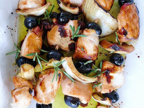 Spiedini di pollo e finocchi, caramellati con miele e limone