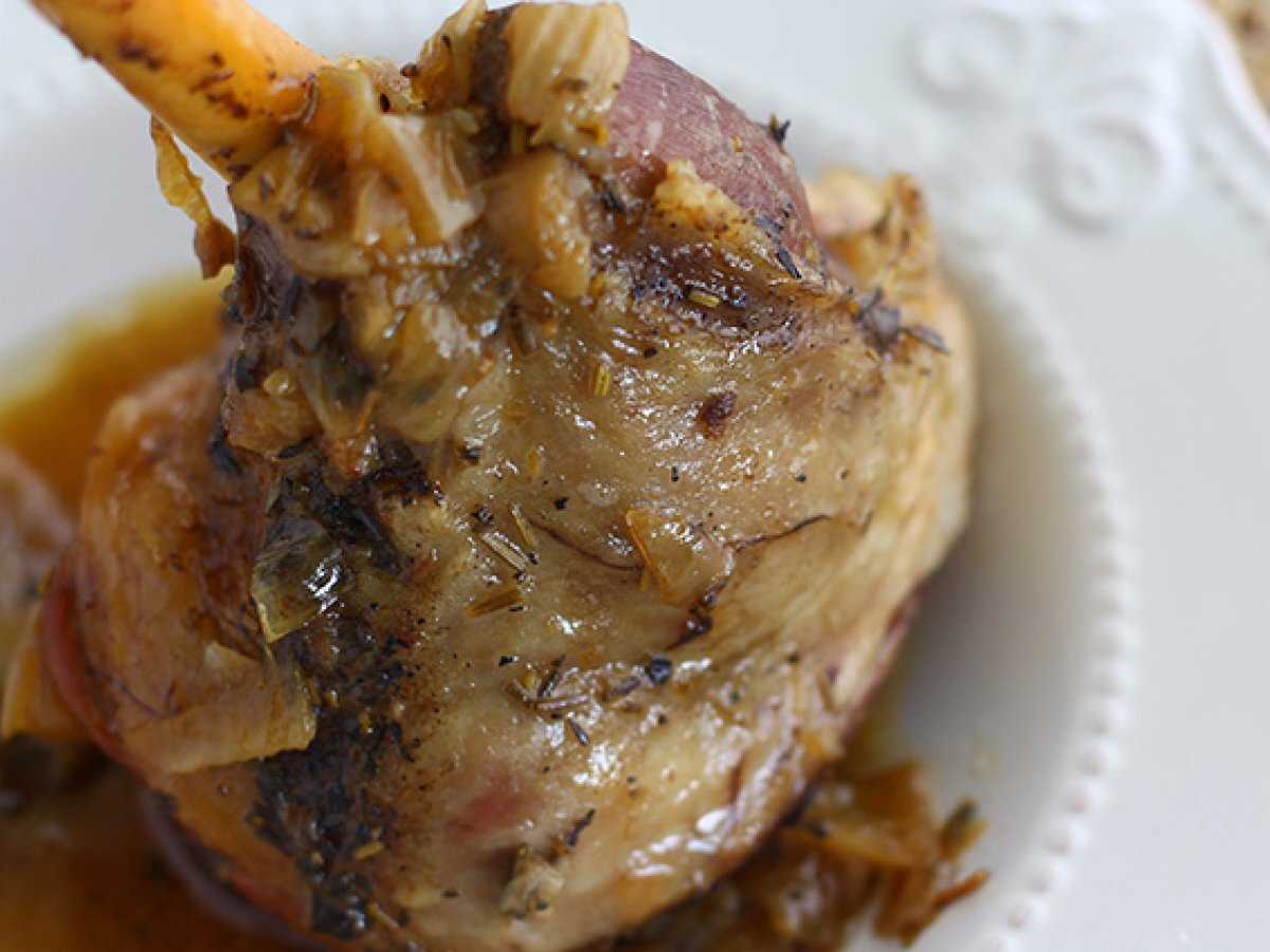 Aggiungete l'acqua, il miele, il timo ed il rosmarino. Salate, pepate e portate ad ebollizione. Coprite con un coperchio e cuocete a fuoco lento per 1 ora e 45 minuti.
