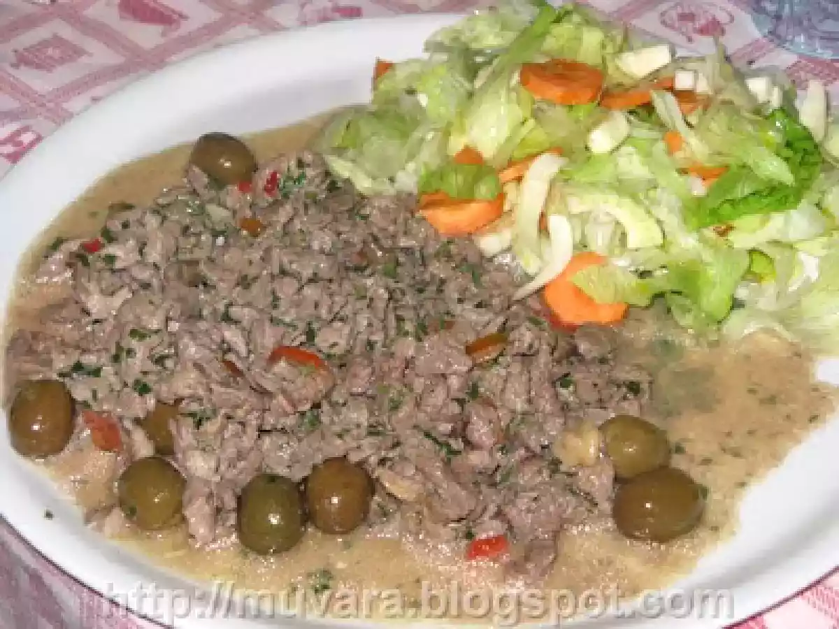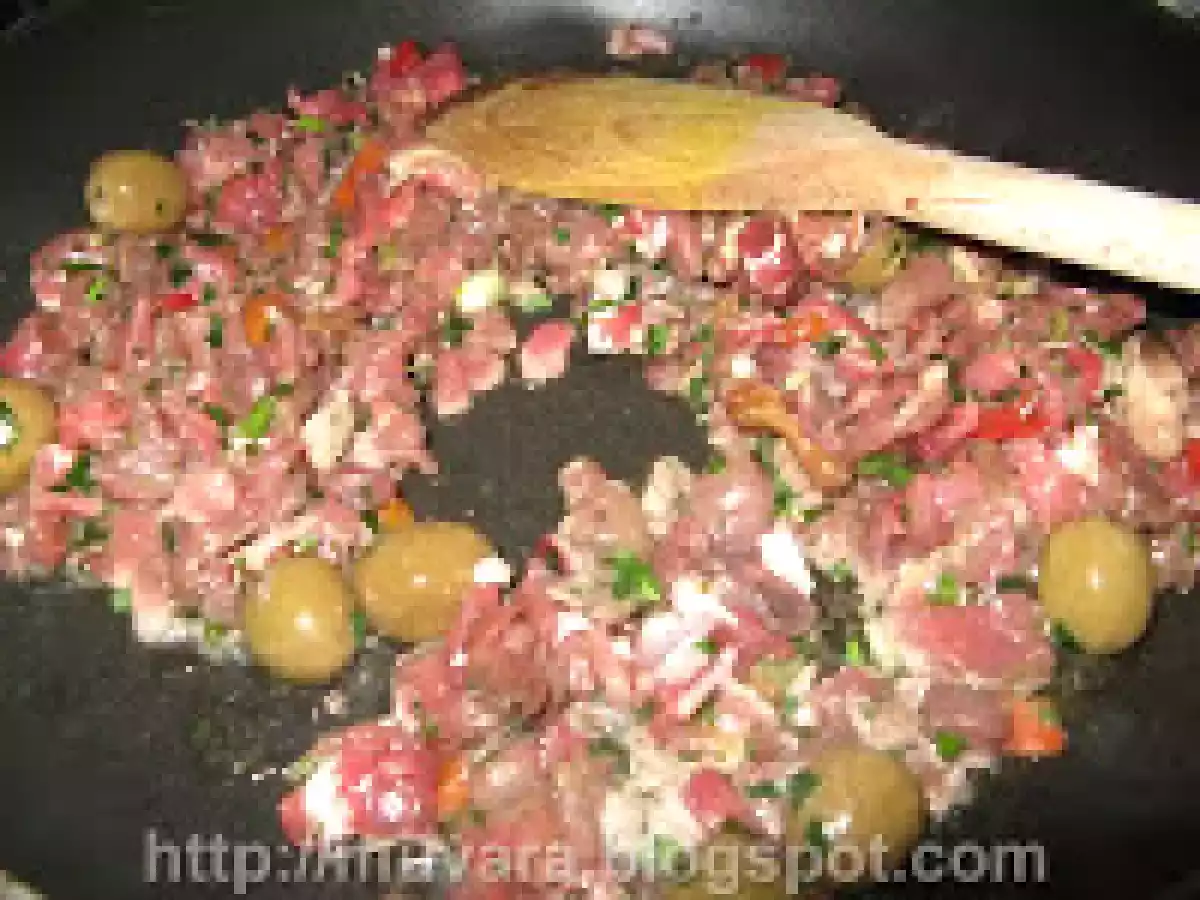 - Tagliate a striscioline la carne il peperone, condite con il prezzemolo, l'aglio e il pomodoro secco tritati.