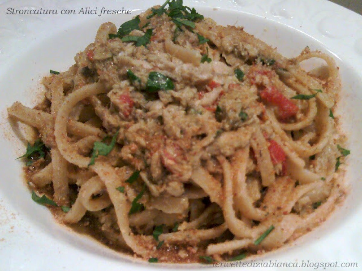 La Stroncatura ('a struncatura' in dialetto calabrese) è un tipo particolare di pasta che, fino agli anni '50, veniva prodotta raccogliendo da terra i residui della molitura di vari tipi di granaglie, tra cui la segale (per saperne di più qui). Una ricetta tipica è quella dove vengono adoperate le alici sottosale, aglio, peperoncino, pangrattato. Ma dato che avevo la stroncatura e le alici fresche ho preparato un sughetto niente niente male eugualmente.