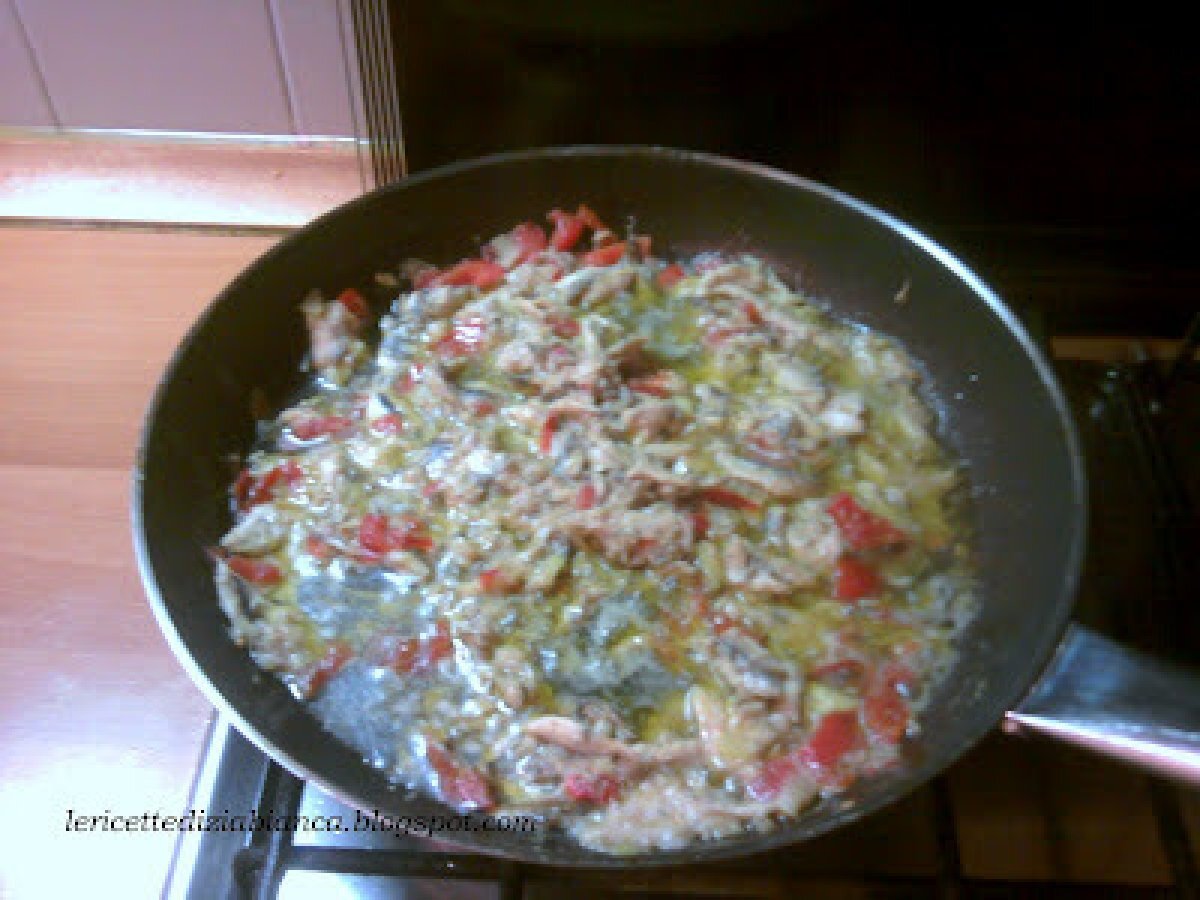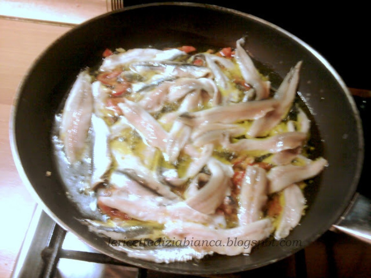 - In una padella ho messo olio evo, due pomodorini a pezzetti, aglio e dopo qualche minuto ho aggiunto le alici fresche (circa 150g) ed il sale.