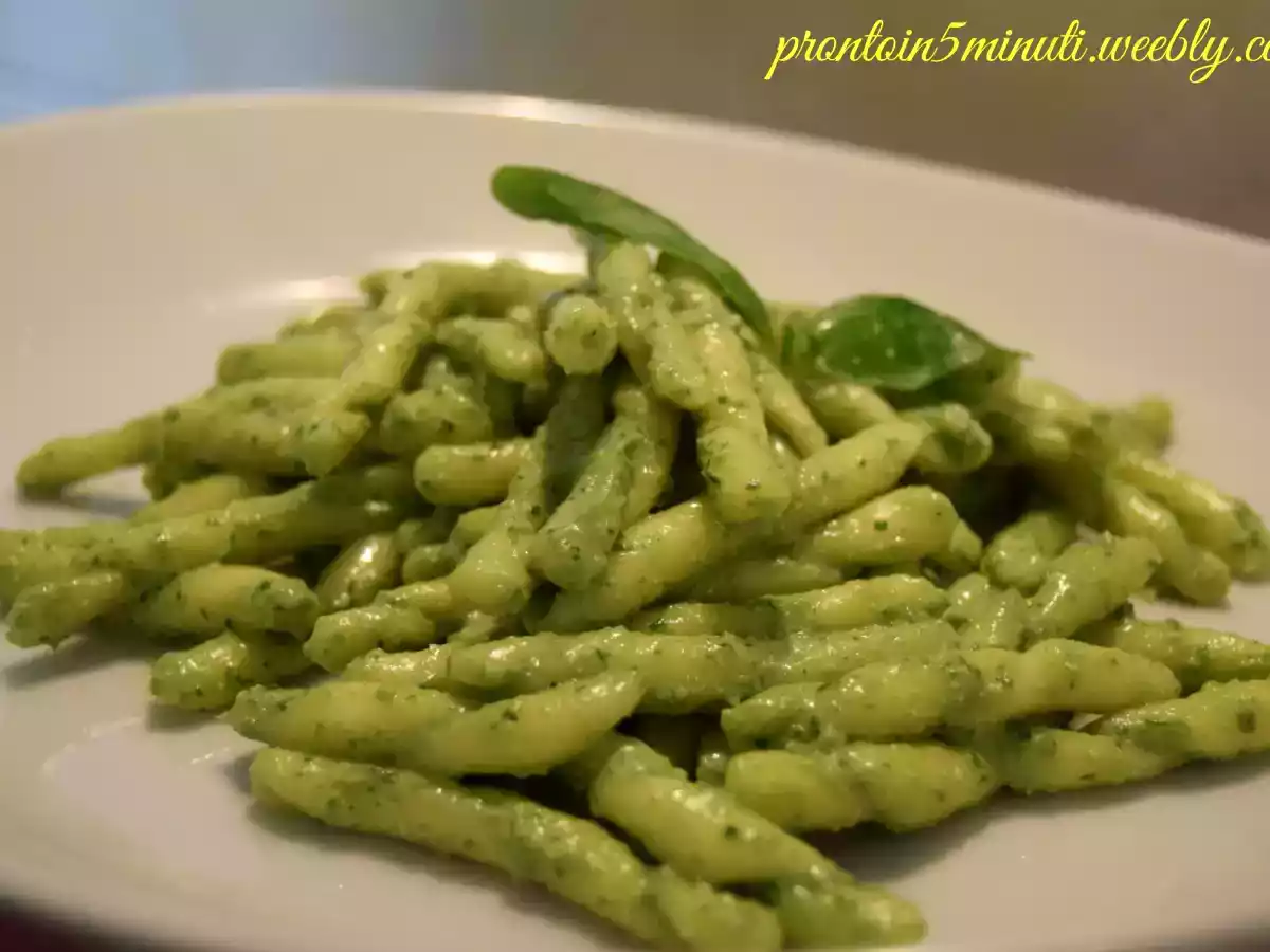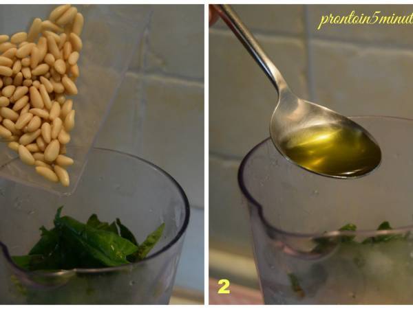 Per prima cosa preparare il pesto, utilizzando un frullatore ad immersione, mettendo il basilico precedentemente lavato e asciugato, i pinoli, olio, sale e se vi piace uno spicchio d'aglio. Dovete ottenere un composto bello cremoso e omogeneo