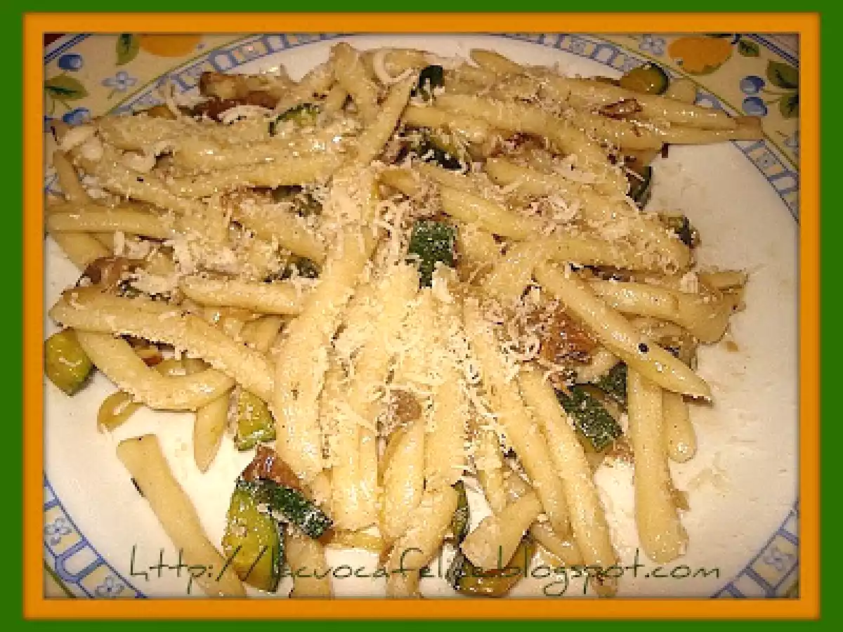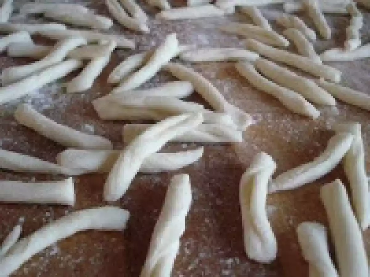 Strozzapreti fatti in casa con porcini e zucchine PrecedenteProssimo Portata principalefacile40 min Invia questa ricetta ad un amico Stampa la ricetta Contatta l'autore della Ricetta Pubblica la foto di questa ricetta Questo è l'impasto a base di farina e acqua. Ingredienti 4 Per gli strozzapreti: 400 g di farina 200 ml di acqua tiepida 1 pizzico di sale Per il condimento: 2 zucchine 1 manciata di funghi porcini secchi 1 scalogno 1 rametto di timo vino bianco per sfumare parmigiano reggiano per spolverare