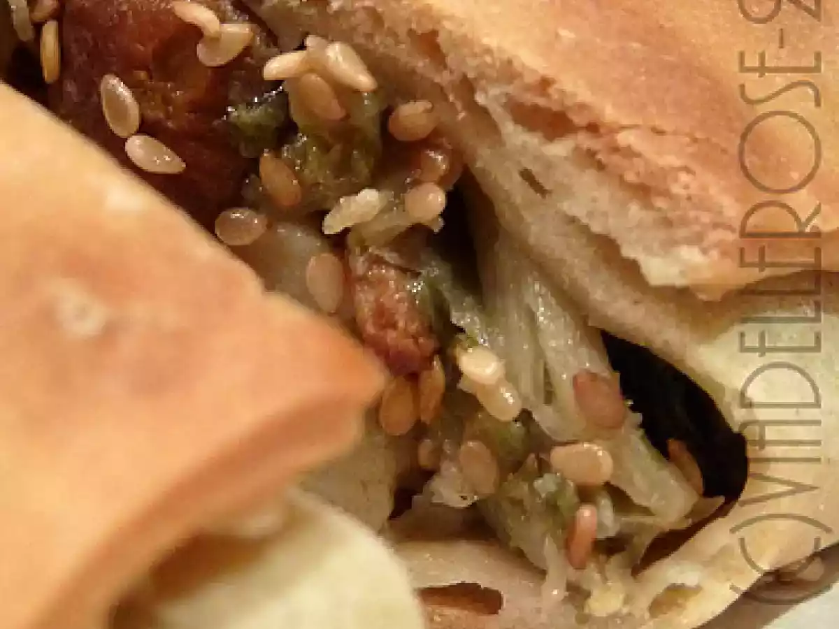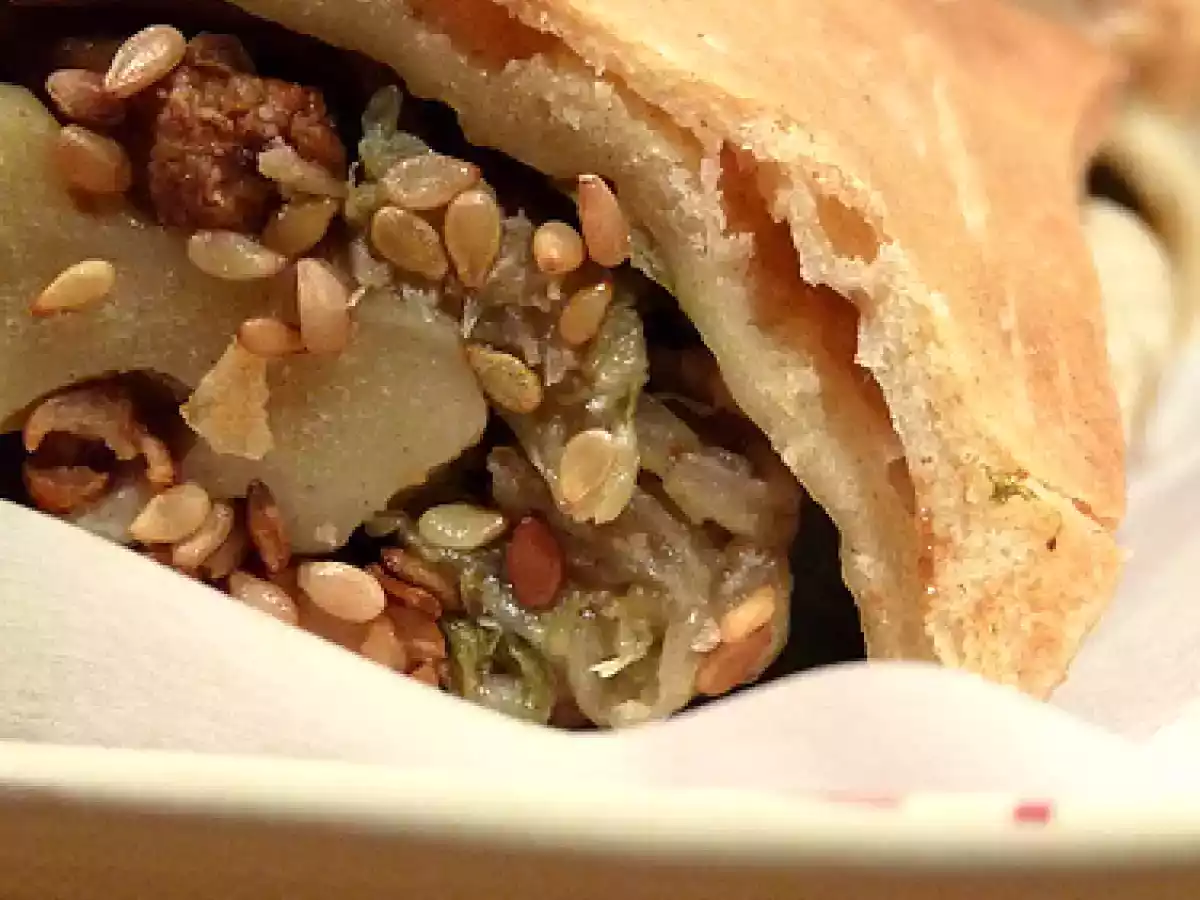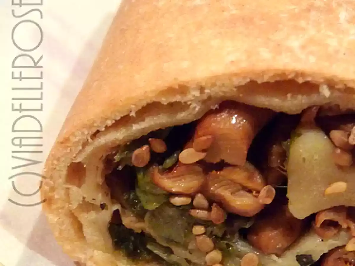 Strudel di scarola e finferli alla cannella e caciocavallo silano vota adesso PrecedenteProssimo Portata principalefacile1 h 55 m Invia questa ricetta ad un amico Stampa la ricetta Contatta l'autore della Ricetta Pubblica la foto di questa ricetta Ingredienti 4 150 g di farina di farro autolievitante 200 g di farina 00 120 ml d'acqua tiepida 20 ml olio d'oliva 1 uova 1 cucchiaino di sale Per la farcia: 300 g di scarola 200 g di finferli 150 g di provola silana 4 cucchiai d'olio evo 1 cucchiaio di grani di sesamo dorato 1 cucchiaino di cannella in polvere 1/2 cucchiaino di noce moscata sale e pepe