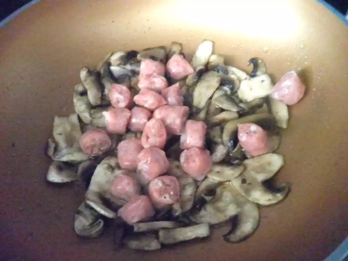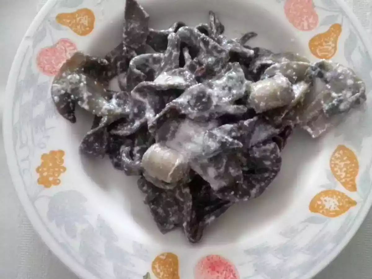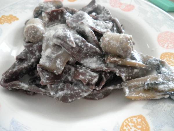 Tagliatelle al cacao con ricotta al tartufo salsiccia e funghi