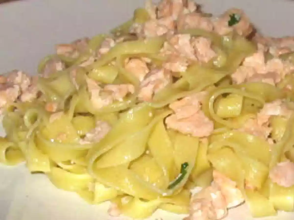 tagliatelle al salmone fresco Portata principalemedia25 min Invia questa ricetta ad un amico Stampa la ricetta Contatta l'autore della Ricetta Pubblica la foto di questa ricetta Ingredienti 2 200 gr. di tagliatelle, una fetta o filetto di salmone, mezza cipolla media, una noce abbondante di margarina vegetale, sale q.b. prezzemolo q.b.