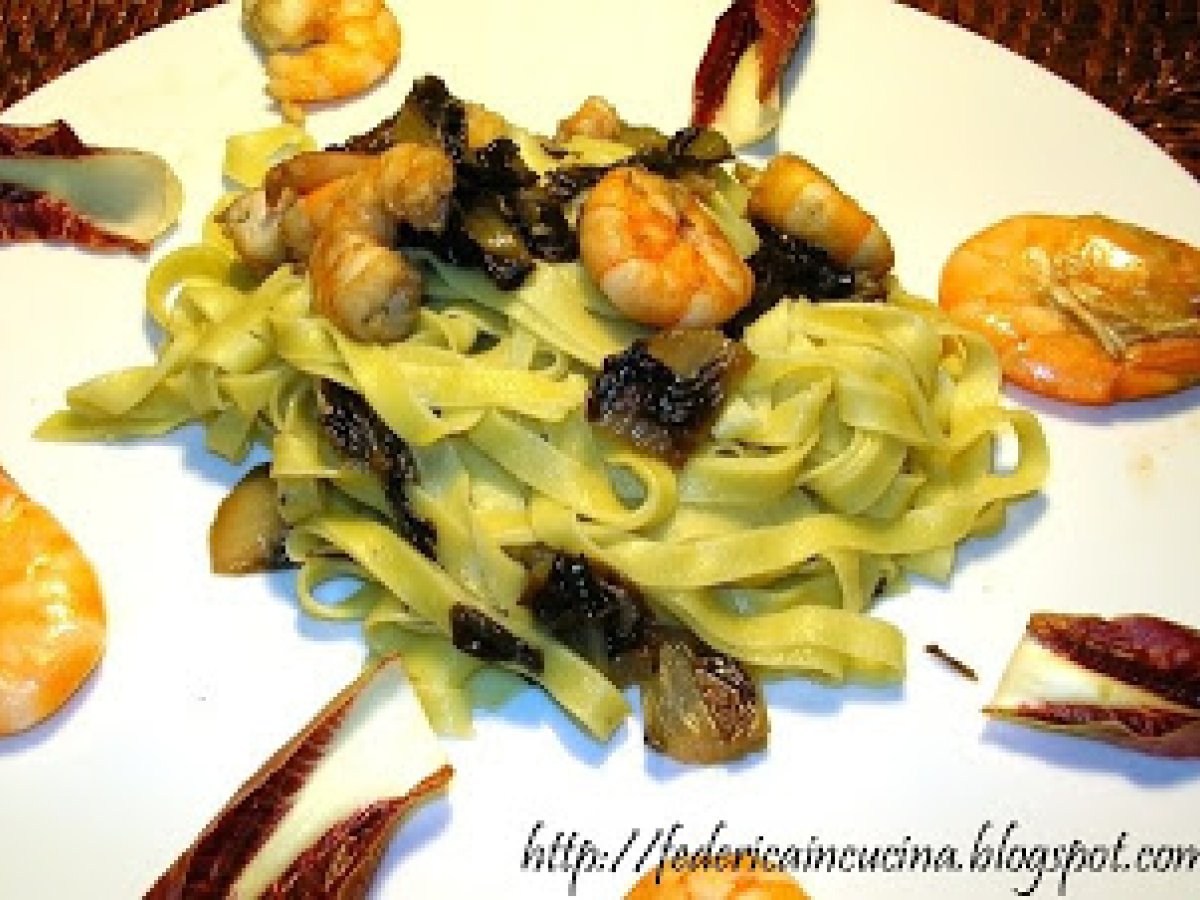 Tagliatelle all'uovo con radicchio di treviso tardivo e mazzancolle vota adesso Portata principalefacile1 ora Invia questa ricetta ad un amico Stampa la ricetta Contatta l'autore della Ricetta Pubblica la foto di questa ricetta Ingredienti 2 Sfoglia all'uovo: 2 uova 100 g farina 00 Molino Rossetto 80 g semola di grano duro rimacinata 1 cucchiaio d'olio d'oliva Condimento: Radicchi di Treviso tardivo Mazzancolle fresche