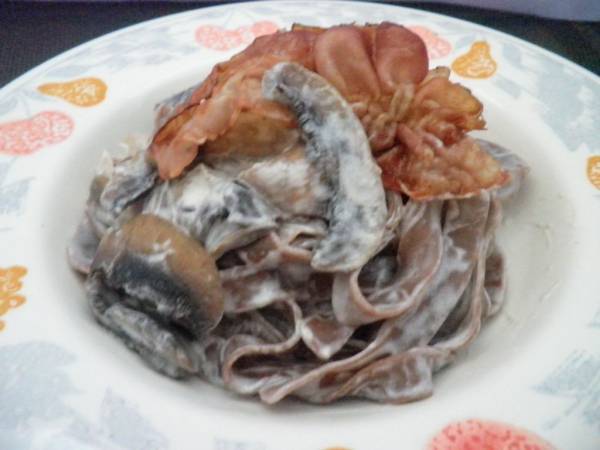 Tagliatelle alla carruba con funghi panna e speck croccante