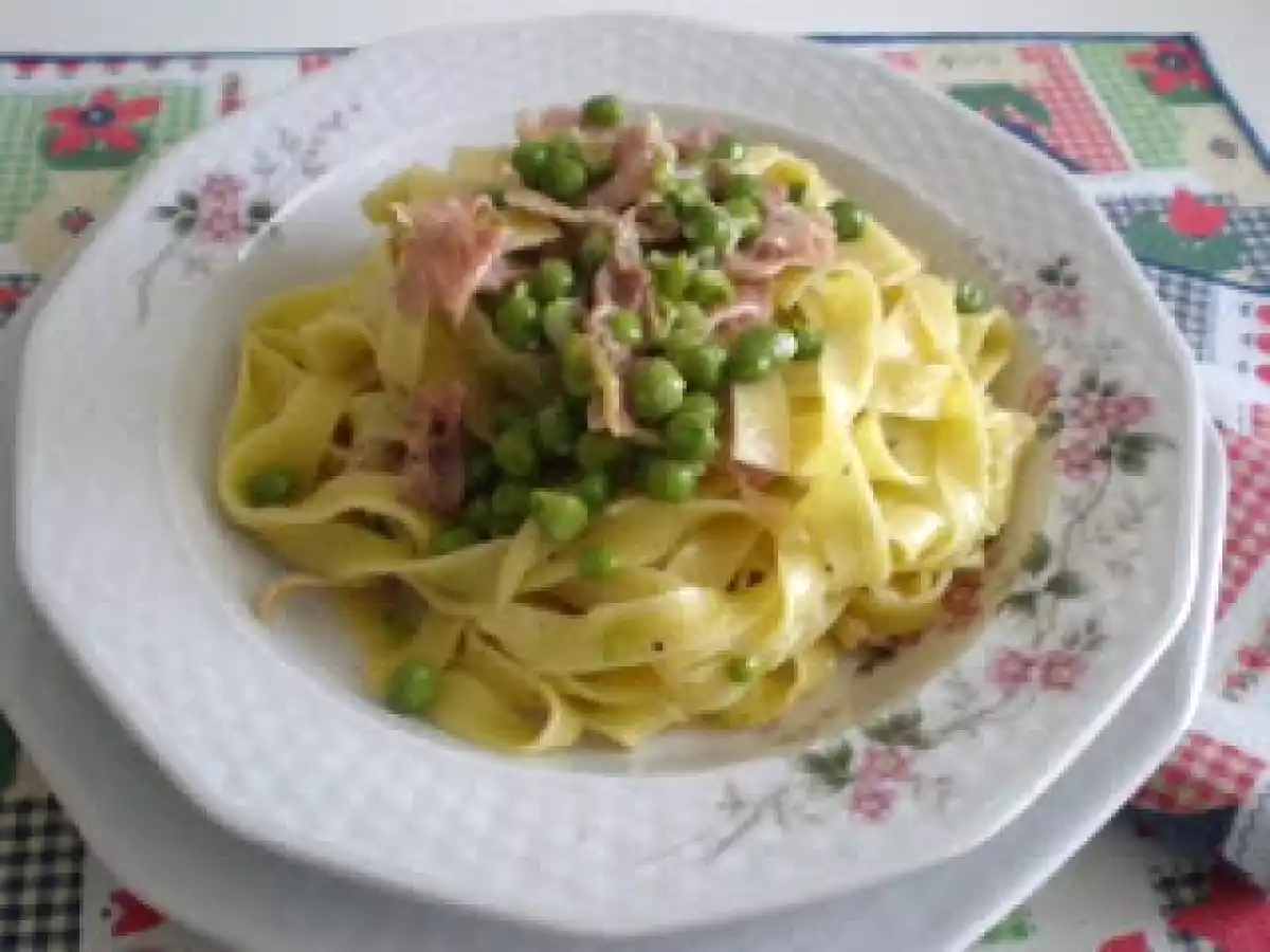 Tagliatelle alla papalina vota adesso Portata principalefacile45 min Invia questa ricetta ad un amico Stampa la ricetta Contatta l'autore della Ricetta Pubblica la foto di questa ricetta Ingredienti 2 130 g di tagliatelle all'uovo cottura 6 min. 100 g di piselli surgelati o freschi 100 g di prosciutto crudo a fette 40 g di burro 1/4 di cipolla 2 uova intere 40 g di parmigiano grattugiato sale e pepe Q.b.