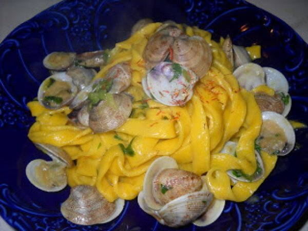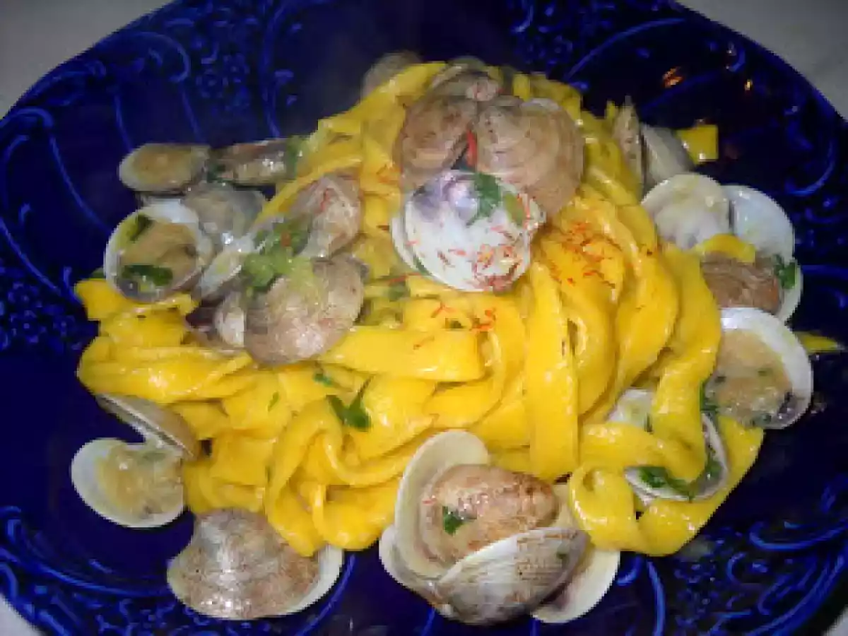 Tagliatelle allo zafferano e pepe del bengala con lupini di mare e zucchine vota adesso Portata principalefacile2 h 10 m Invia questa ricetta ad un amico Stampa la ricetta Contatta l'autore della Ricetta Pubblica la foto di questa ricetta Ingredienti 2 per le tagliatelle: 2 uova intere 200 g di farina una bustna di zafferano pepe del Bengala (quantita' a piacere) per il condimento una zucchina 300 g di lupini di mare (tipo vongole) uno spicchio di aglio intero pepe del Bengala un ciuffo di prezzemolo tritato olio evo, sale