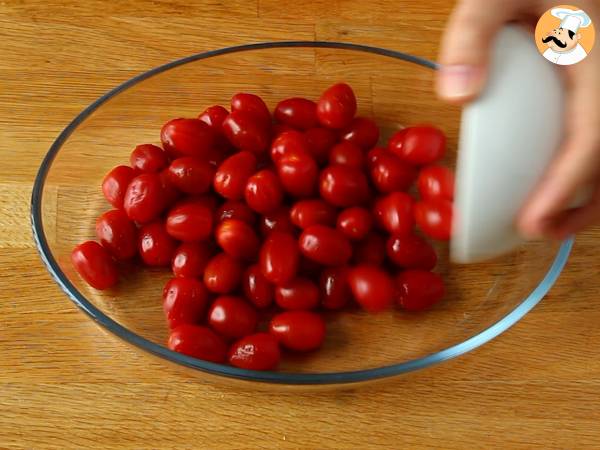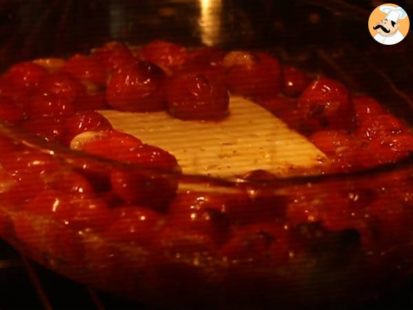 Sfornate il piatto dal forno e schiacciate la feta con una forchetta. Poi mescolate con i pomodorini.
