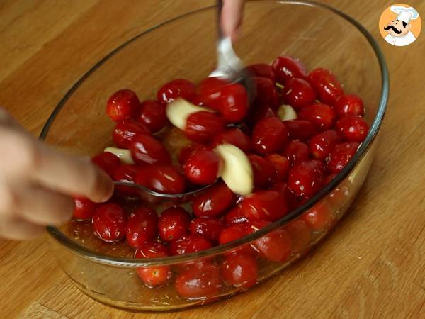 Sbucciate l'aglio ed eliminate il germe. Lavate i pomodorini, poi trasferiteli in un piatto da forno