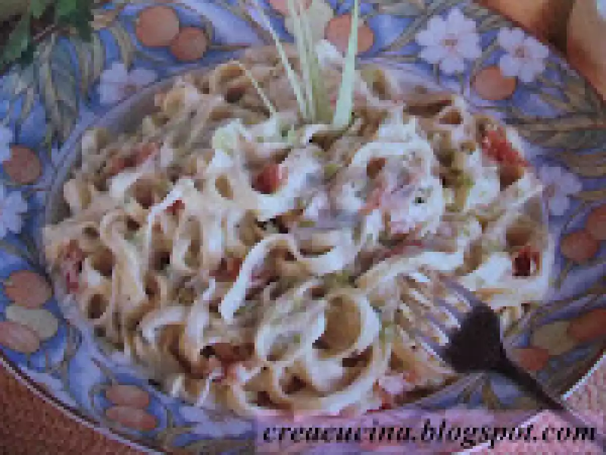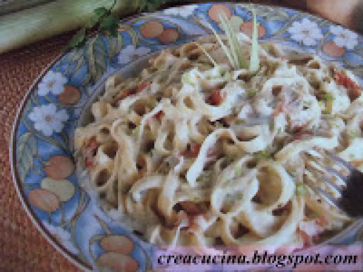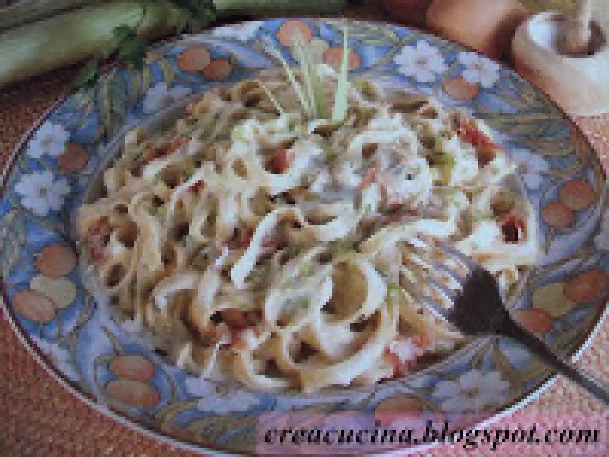 Tagliatelle con porri e pancetta vota adesso PrecedenteProssimo Portata principalefacile45 min Invia questa ricetta ad un amico Stampa la ricetta Contatta l'autore della Ricetta Pubblica la foto di questa ricetta Ingredienti 4 400 g di tagliatelle 200 g di besciamella 3 cucchiai di prezzemolo tritato 150 g di porri 150 g di pancetta affumicata a cubetti 2 tuorli olio extra vergine di oliva parmigiano grattugiato sale e pepe
