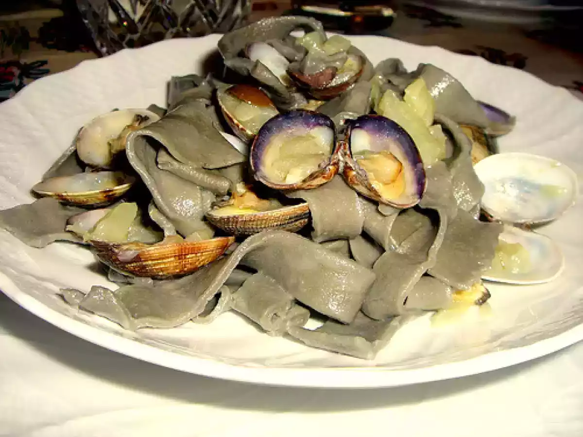 Tagliatelle nere al guazzetto di vongole, finocchi e olive vota adesso Portata principalefacile40 min557 Kcal Invia questa ricetta ad un amico Stampa la ricetta Contatta l'autore della Ricetta Pubblica la foto di questa ricetta Ingredienti 4 360 gr. semola di grano duro rimacinata 4 uova 1 sacchetta di nero di seppia 1 finocchio 1 spicchio aglio 1/4 cipolla rossa 500 gr. vongole veraci 12 olive gaeta 1 /4 scorza di limone biologico olio extravergine sale e pepe