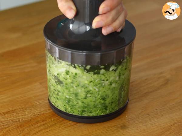 Ora mettete nel frullatore la cipolla, lo spicchio d'aglio, il prezzemolo ed il basilico. Quindi tritate finemente.