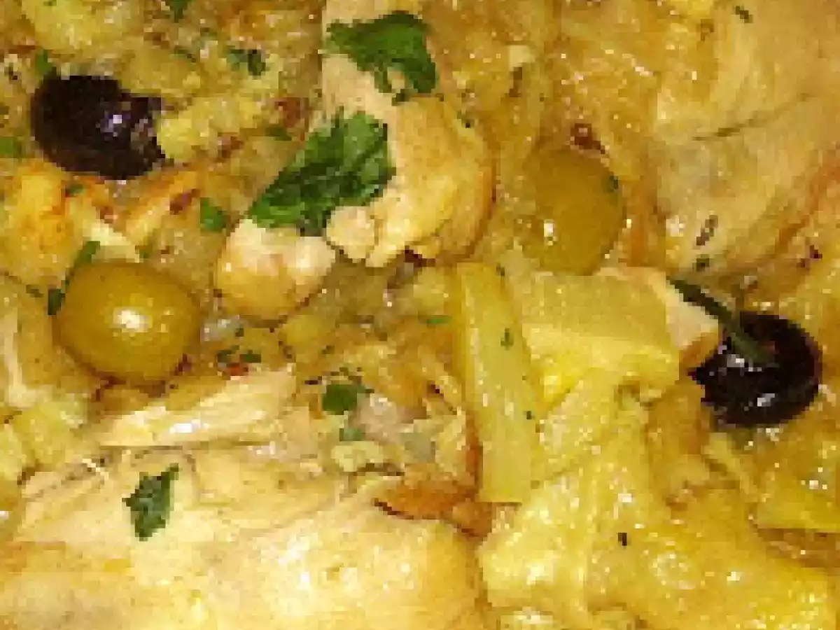 Tajine di pollo e olive vota adesso PrecedenteProssimo Portata principalefacile50 min504 Kcal Invia questa ricetta ad un amico Stampa la ricetta Contatta l'autore della Ricetta Pubblica la foto di questa ricetta Ingredienti 4 1 pollo intero olio d'oliva 1-2 finocchi grandi 2 cipolle, pelate e tritate grossolanamente 1 mazzetto di coriandolo fresco 4 spicchi d'aglio, pelati e affettati 80 g di olive nere e verdi, private del nocciolo 1 bella presa di zafferano 500 g di brodo di pollo biologico Per il condimento speziato: 1 cucchiaino colmo di semi di coriandolo schiacciati 1 cucchiaino raso di semi di cumino macinato 1 cucchiaino colmo di zenzero macinato 2 cucchiai di olio di oliva sale marino e pepe appena macinato Costo stimato: 8.67Euros€ (2.17€/Porzioni)