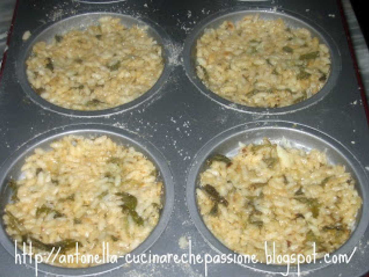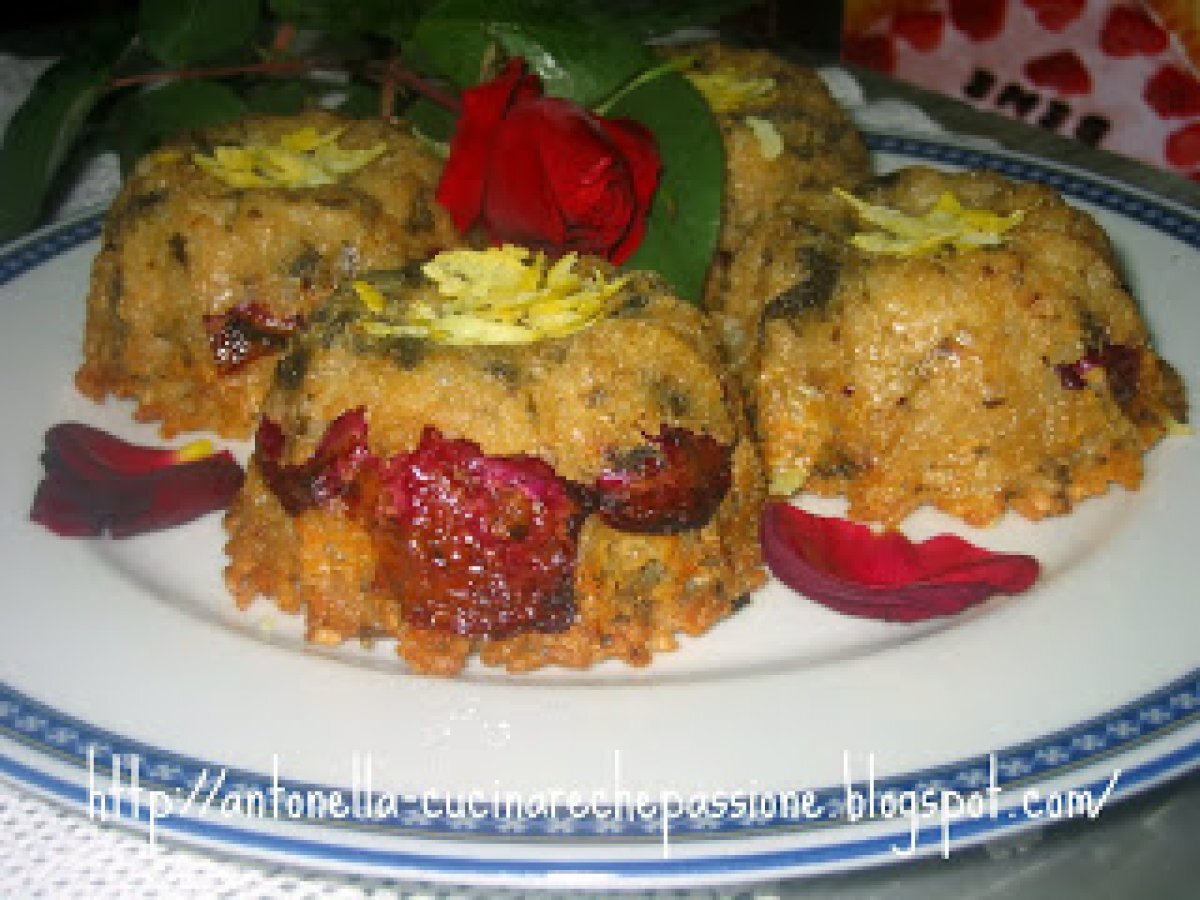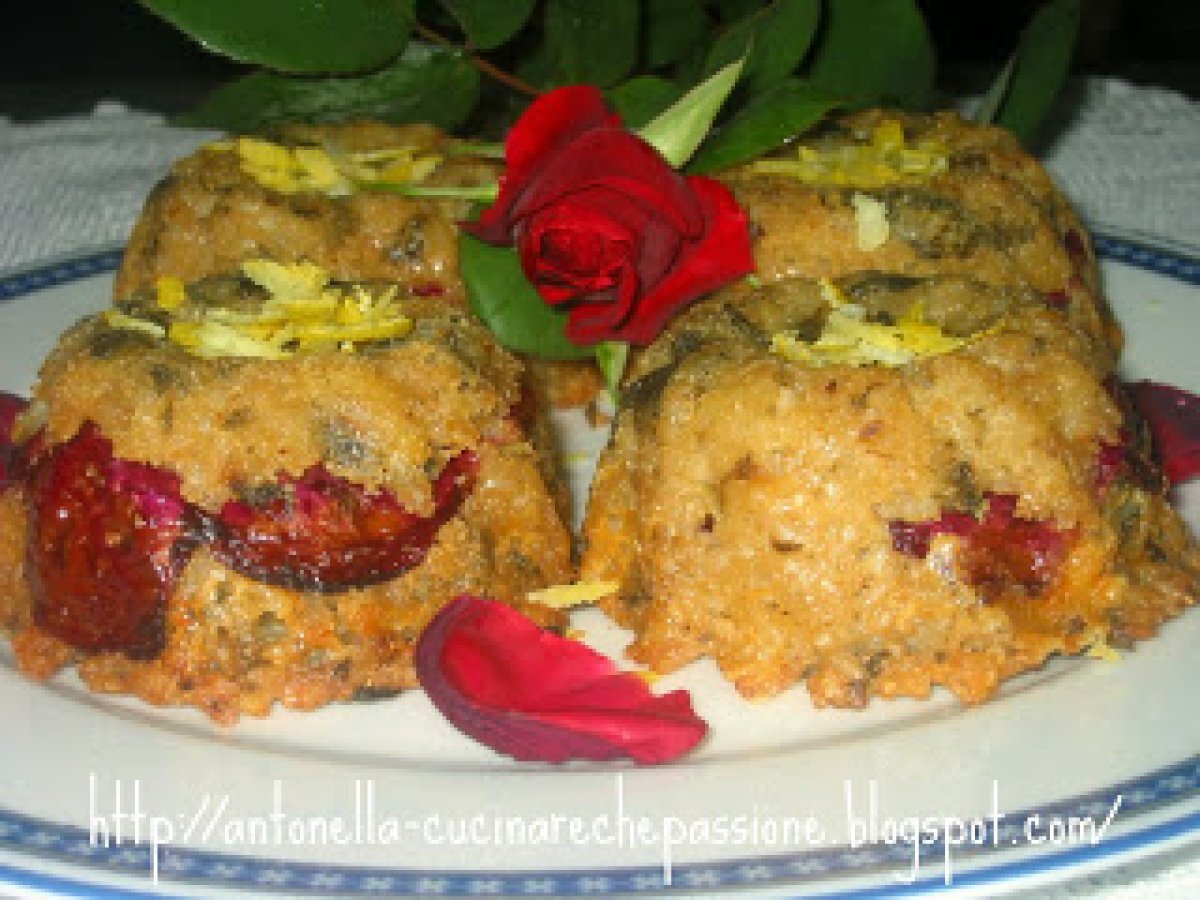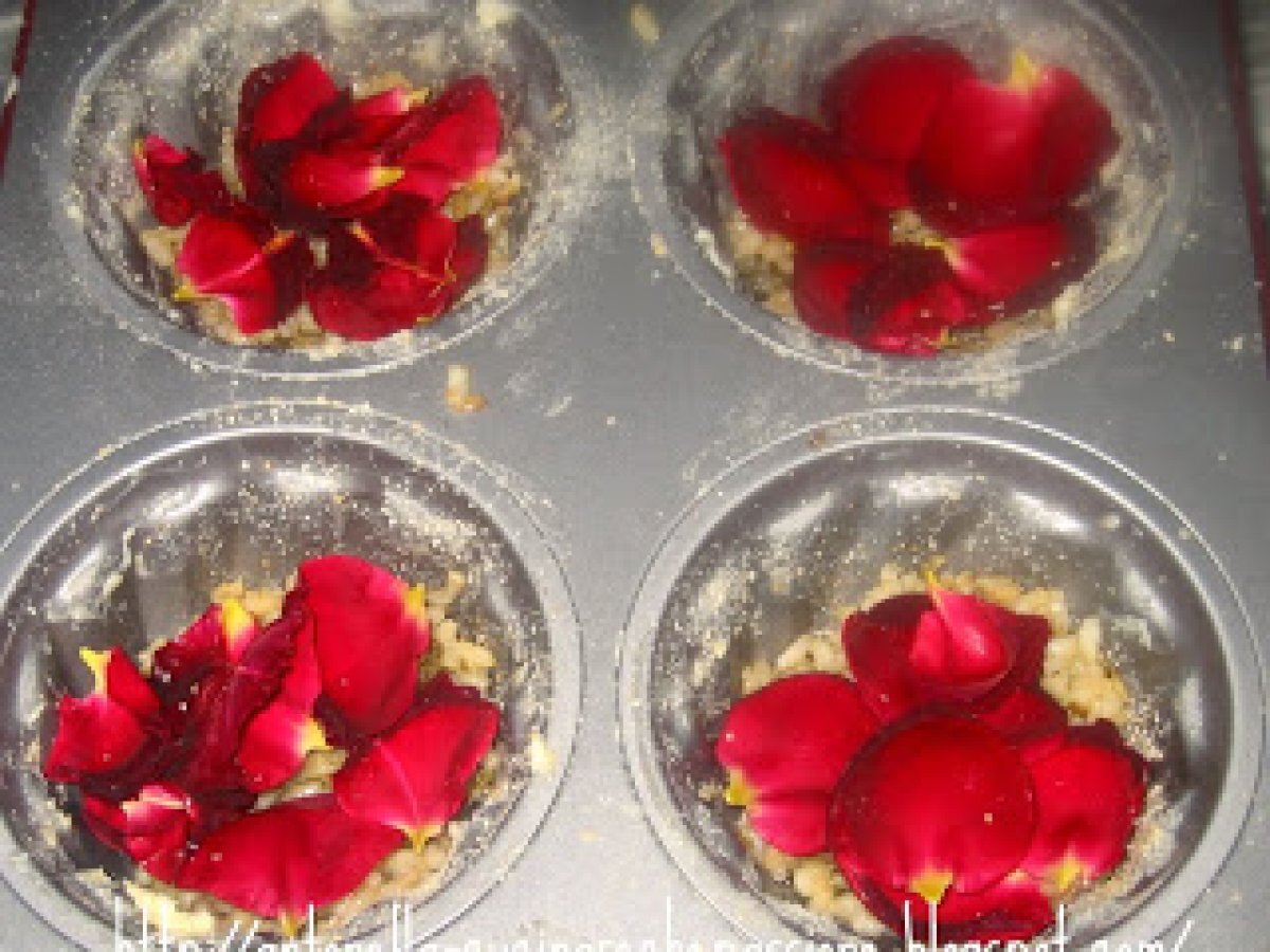 - Ora viene il bello devo anche rinnovare gli stampi comprato alla Lidl ben imburrati e cosparsi di pangrattato,ed mettete il primo strato di riso ricoperto con i petali di rosa un altro strato di risoe uno di formaggi