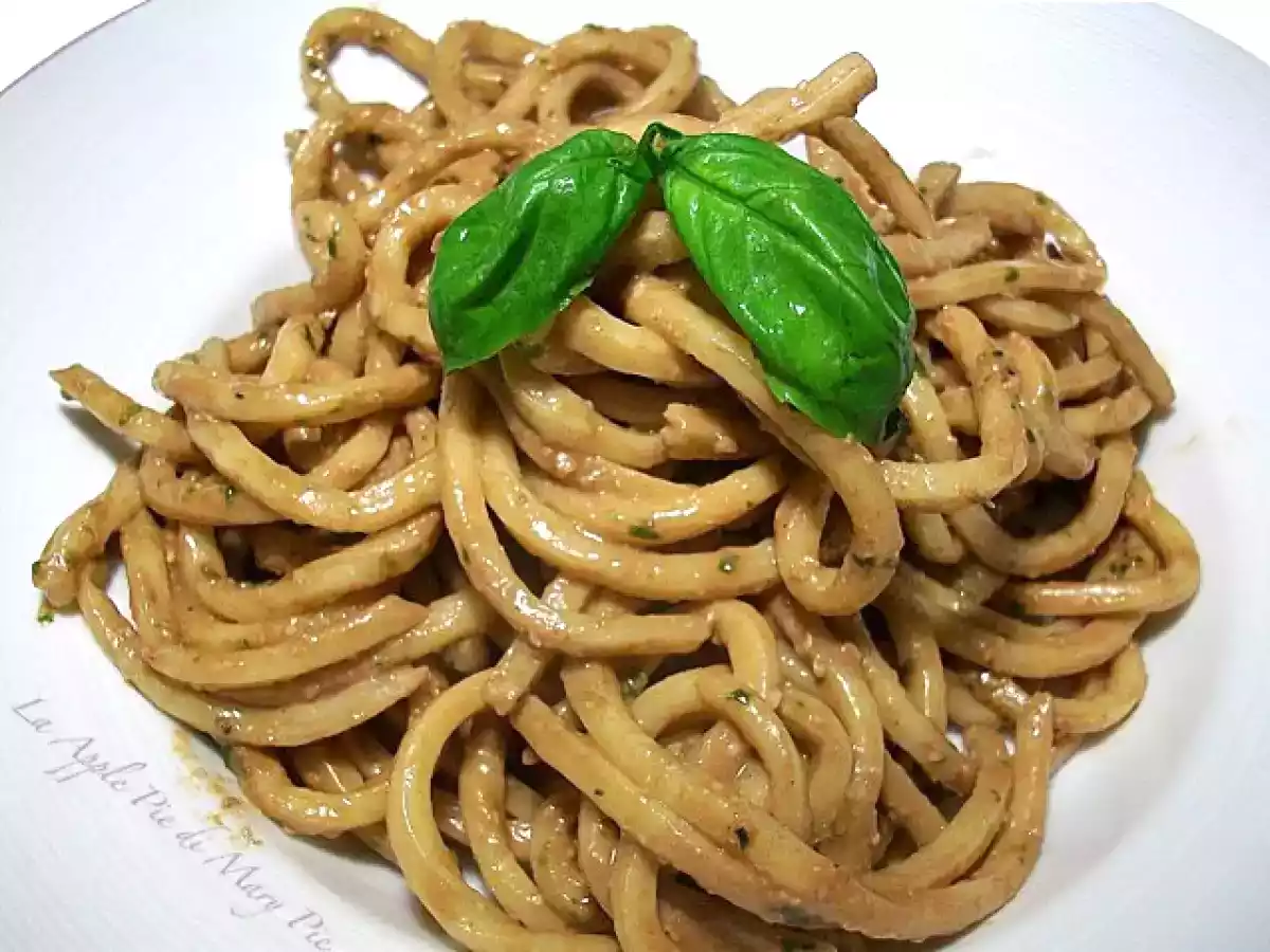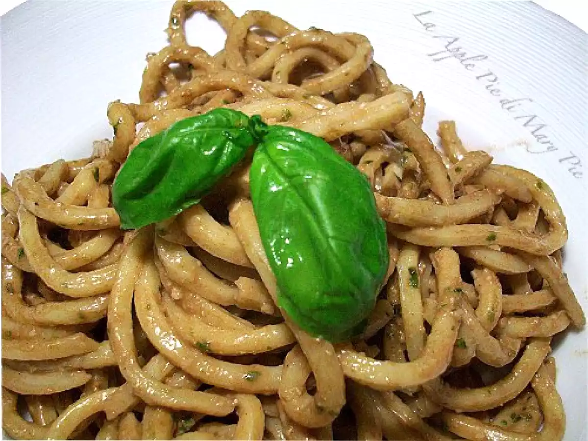 Tonnarelli al pesto di cioccolato e basilico PrecedenteProssimo Portata principalemedia1 h 7 m888 Kcal Invia questa ricetta ad un amico Stampa la ricetta Contatta l'autore della Ricetta Pubblica la foto di questa ricetta Ingredienti 4 Per la pasta: 300 g farina 00 3 uova medie 1 pizzico di sale Per il pesto: 25 g basilico appena colto 150 g olio extravergine di oliva 60 g pinoli 100 g pecorino grattugiato 25 g cioccolato fondente del Venezuela al 100% grattugiato scorza di 1/2 limone (lui ci mette anche il succo, del mezzo limone, io non sono d'accordo) 1/2 cucchiaino di sale marino