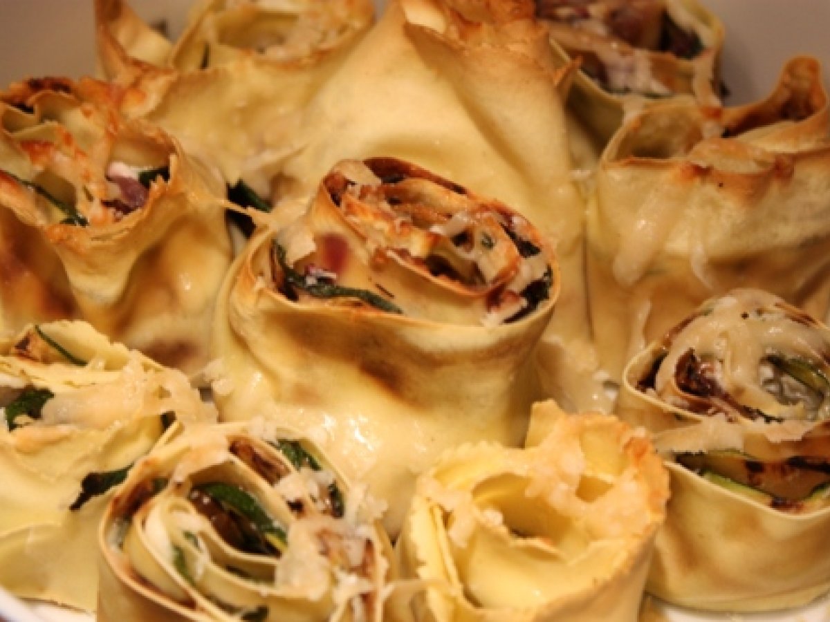Torta di rose di pasta fresca vota adesso PrecedenteProssimo Portata principalefacile50 min1193 Kcal Invia questa ricetta ad un amico Stampa la ricetta Contatta l'autore della Ricetta Pubblica la foto di questa ricetta Ingredienti 4 600 g di farina 400 g di semola 8 uova grandi 6 tuorli un goccio di olio extravergine 1 pizzico di sale Formaggio morbido Zucchine Cipolle rosse Sale grosso per l'acqua di cottura Un filo di olio extravergine e Parmigiano grattugiato per gratinare