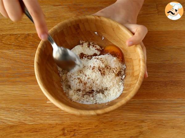 Mescolate la ricotta, 20 gr di parmigiano, 1 uovo, la noce moscata, il sale ed il pepe. Coprite con la pellicola la ciotola e mettete in frigo.