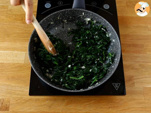 Rosolate lo scalogno e l'aglio in padella con olio d'oliva. Aggiungete gli spinaci e cuocete per 5 minuti a fuoco lento mescolando.