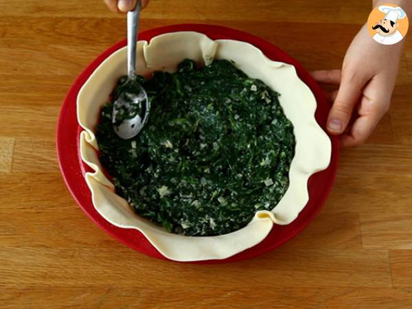 Ora sminuzzate gli spinaci e mescolateli con 60 gr di parmigiano, il sale, il pepe ed 1 uovo. Stendete un rotolo di pasta brisée in uno stampo imburrato e ripartite sulla base la preparazione a base di spinaci.