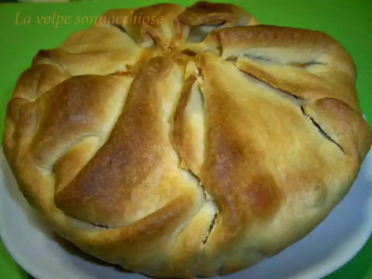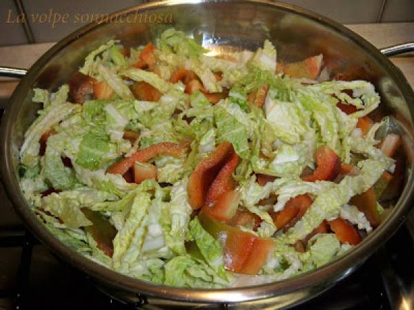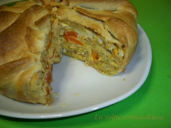 Torta peperoni e verza PrecedenteProssimo Portata principalefacile1 ora Invia questa ricetta ad un amico Stampa la ricetta Contatta l'autore della Ricetta Pubblica la foto di questa ricetta Ingredienti 2 1 rotolo di pasta brisé 5 cucchiai d'olio 1 noce di burro 1/2 cipolla tritata 1 peperone rosso di grosse dimensioni 1/4 di verza tritata 1 pizzico di sale 1 pizzico di pepe 2 uova 70 gr. di grana padano qualche tocchetto di brie a piacere